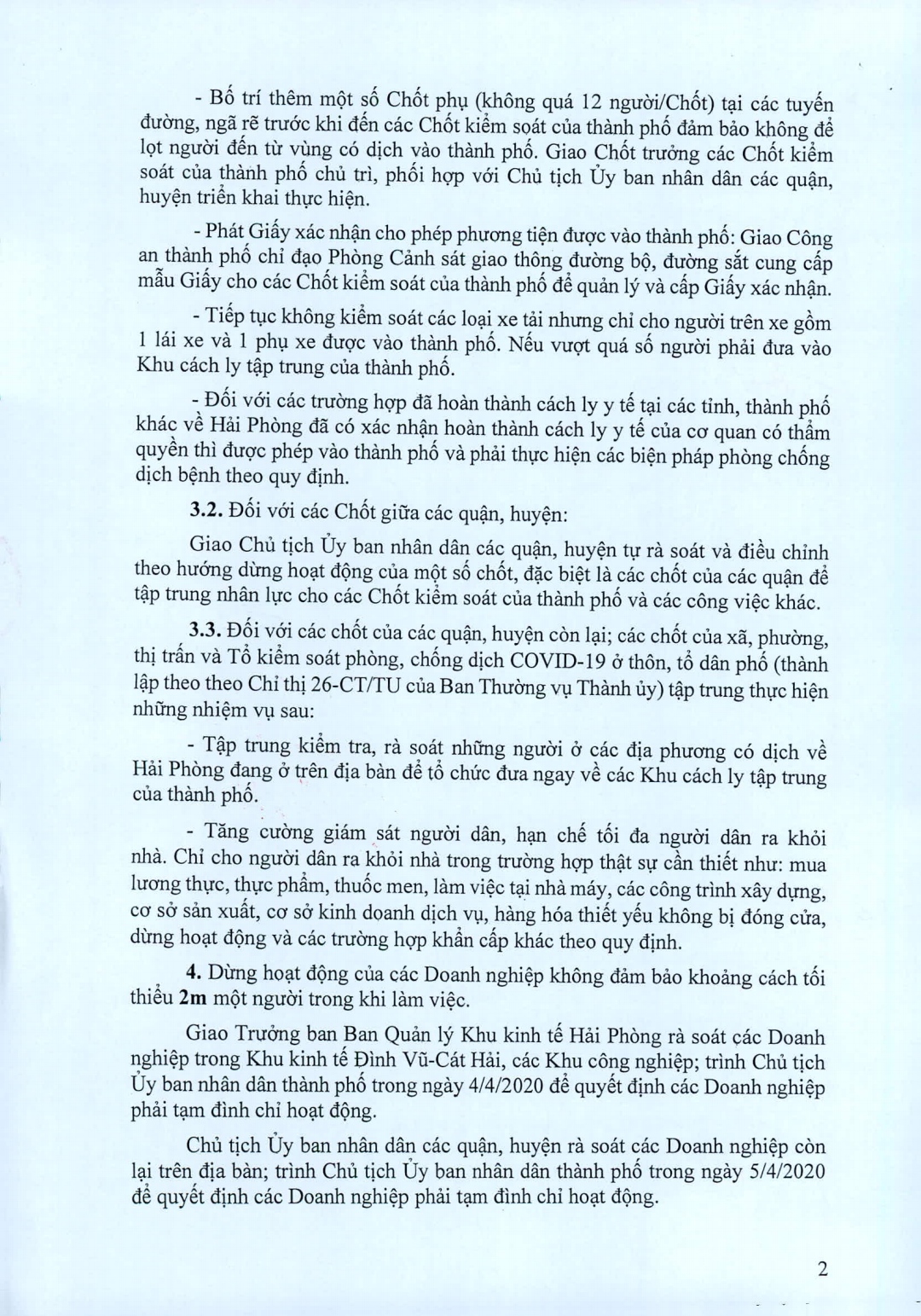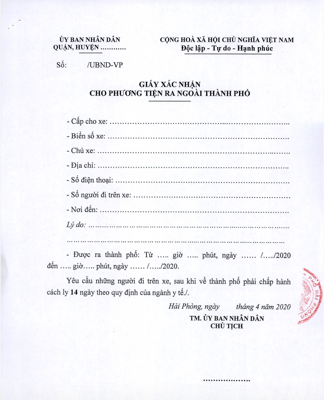 2. Đối với những trường hợp từ Hải Phòng đi đến các tỉnh, thành phố khác phải có Giấy xác nhận cho phương tiện ra ngoài thành phố của Chủ tịch UBND các quận, huyện (gửi kèm mẫu); khi trở về từ các địa phương có dịch phải thực hiện các ly y tế tập trung theo quy định.