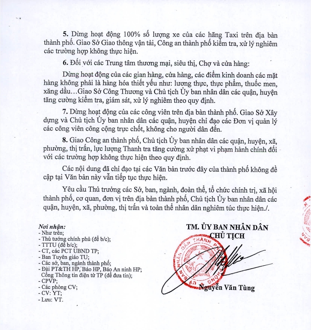 5. Dừng hoạt động 100% số lượng xe của các hãng Taxi trên địa bàn thành phố. Giao Sở Giao thông Vận tải, Công an thành phố kiểm tra, xử lý nghiêm các trường hợp không thực hiện.