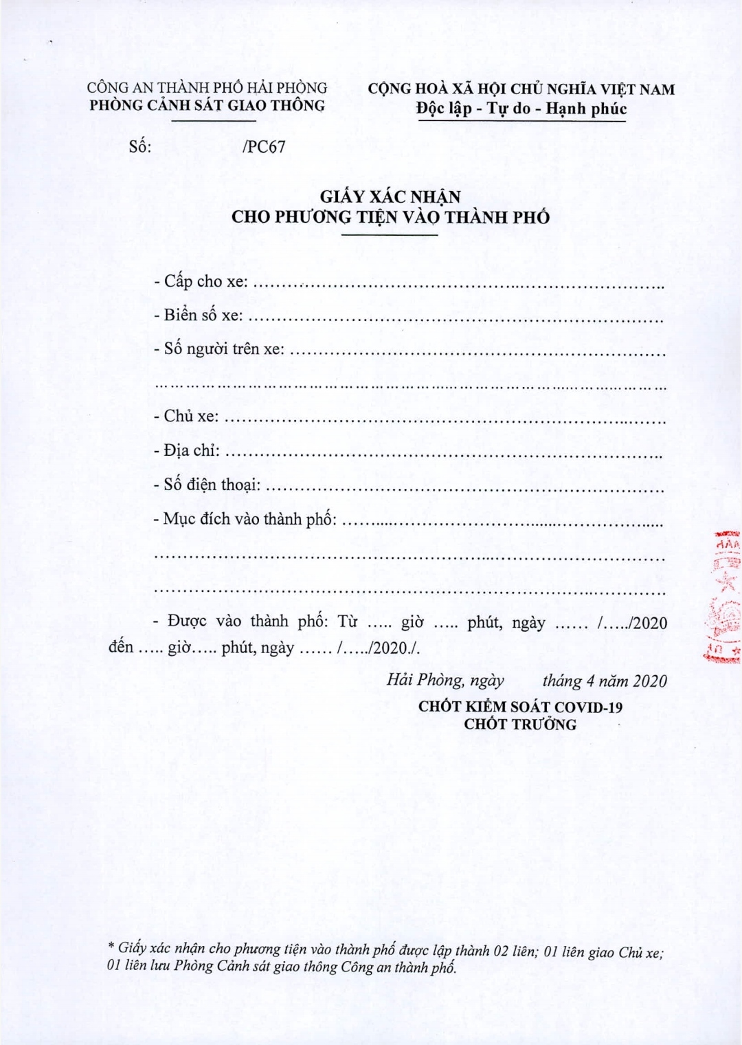 – Phát Giấy xác nhận cho phép phương tiện được vào thành phố; Giao Công an thành phố chỉ đạo Phòng Cảnh sát giao thông đường bộ, đường sắt cung cấp mẫu Giấy cho các Chốt Kiểm soát của thành phố để quản lý và cấp Giấy xác nhận.