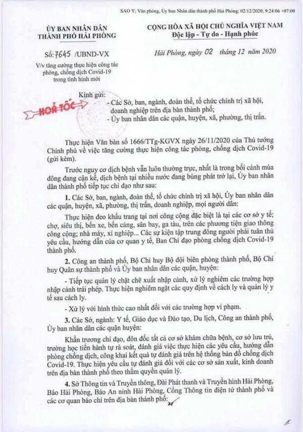 Thực hiện Văn bản số 1666/TTg-KGVX ngày 26/11/2020 của Thủ tướng Chinh phủ về việc tăng cường thực hiện công tác phòng, chống dịch Covid-19. Trước nguy cơ dịch bệnh vẫn luôn thường trục, nhất là trong bối cảnh mùa dông đang cận kề, dịch bệnh tại nhiều nước đang bùng phát trở lại, Ủy ban nhân dân thành phố tiếp tục chỉ đạo như sau: