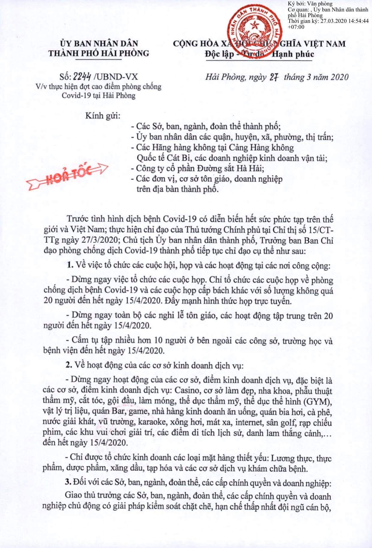 – Dừng ngay hoạt động của các cơ sở, điểm kinh doanh dịch vụ, đặc biệt là các cơ sở, điểm kinh doanh dịch vụ: Casino, cơ sở làm đẹp, nha khoa, phẫu thuật thẩm mỹ, cắt tóc, gội đầu, làm móng, thể dục thẩm mỹ, thể dục thể hình (GYM), vật lý trị liệu, quán Bar, game, nhà hàng kinh doanh ăn uống, quán bia hơi, cà phê, nước giải khát, vũ trường, karaoke, xông hơi, mát xa, internet, sân golf, rạp chiếu phim, các khu vui chơi giải trí, các điểm di tích lịch sử, danh lam thắng cảnh,… đến hết ngày 15/4/2020.