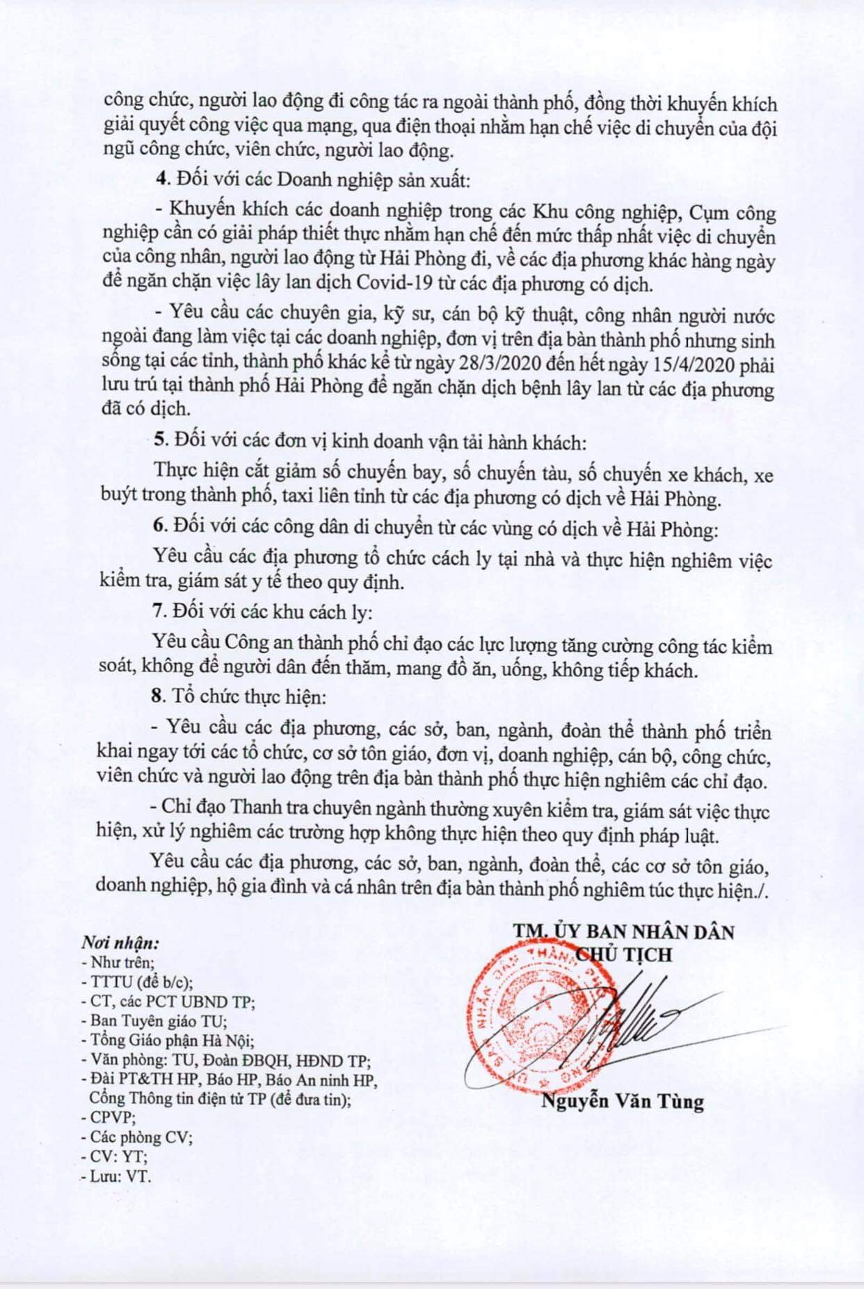– Yêu cầu các chuyên gia, kỹ sư, cán bộ kỹ thuật, công nhân người nước ngoài đang làm việc tại các doanh nghiệp, đơn vị trên địa bàn thành phố nhưng sinh sống tại các tỉnh, thành phố khác kể từ ngày 28/3/2020 đến hết ngày 15/4/2020 phải lưu trú tại thành phố Hải Phòng để ngăn chặn dịch bệnh lây lan từ các địa phương đã có dịch.