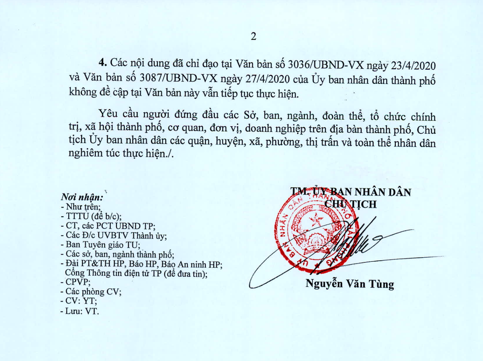 4. Các nội dung đã chỉ đạo tại Văn bản số 3036/UBND-VX ngày 23/4/2020 và Văn bản số 3087/UBND-VX ngày 27/4/2020 của UBND thành phố không đề cập tại Văn bản này vẫn tiếp tục thực hiện.