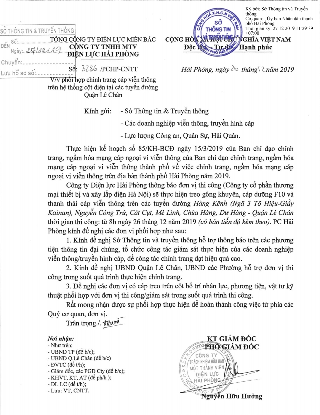 Công ty TNHH MTV Điện lực Hải Phòng kính đề nghị UBND quận Lê Chân, UBND các phường hỗ trợ đơn vị thi công (Công ty Cổ phần Thương mại thiết bị và xây lắp điện Hà Nội) trong quá trình thực hiện chỉnh trang; các đơn vị có cáp treo trên cột bố trí nhân lực, phương tiện, vật tư kỹ thuật phối hợp với đơn vị thi công/giám sát trong quá trình thi công.