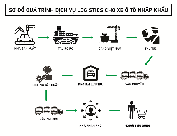 Từ quốc gia xuất xứ, hầu hết xe ô tô phải được chuyển chở bằng tàu biển RO-RO chuyên dụng và xe tải đầu kéo rơ-mooc lồng. Tại Việt Nam, chỉ các cửa khẩu cảng Cái Lân, Hải Phòng, Nghi Sơn, Đà Nẵng, TP Hồ Chí Minh và Bà Rịa Vũng Tàu mới được phép nhập khẩu xe ô tô dưới 16 chỗ. Do đó, cảng biển tiếp nhận phải vừa hợp lệ lại vừa có năng lực đảm bảo khả năng khai thác loại hàng này. Trên đường bộ, xe đầu kéo chuyên chở ô tô cũng sử dụng rơ-mooc lồng để chở từ 1 đến 7 xe ô tô cùng lúc. Sau đó, để lưu trữ ô tô nguyên chiếc, đơn vị logistics phải có kho bãi đạt các tiêu chuẩn khắt khe về diện tích, môi trường xung quanh, tuyệt đối an ninh an toàn…, đồng thời phải có công trình phụ trợ kèm theo. Còn về các thủ tục, ngoài hải quan, mặt hàng ô tô còn phải trải qua các công đoạn khác như đăng kiểm hay kiểm tra về khí thải, nhiên liệu…