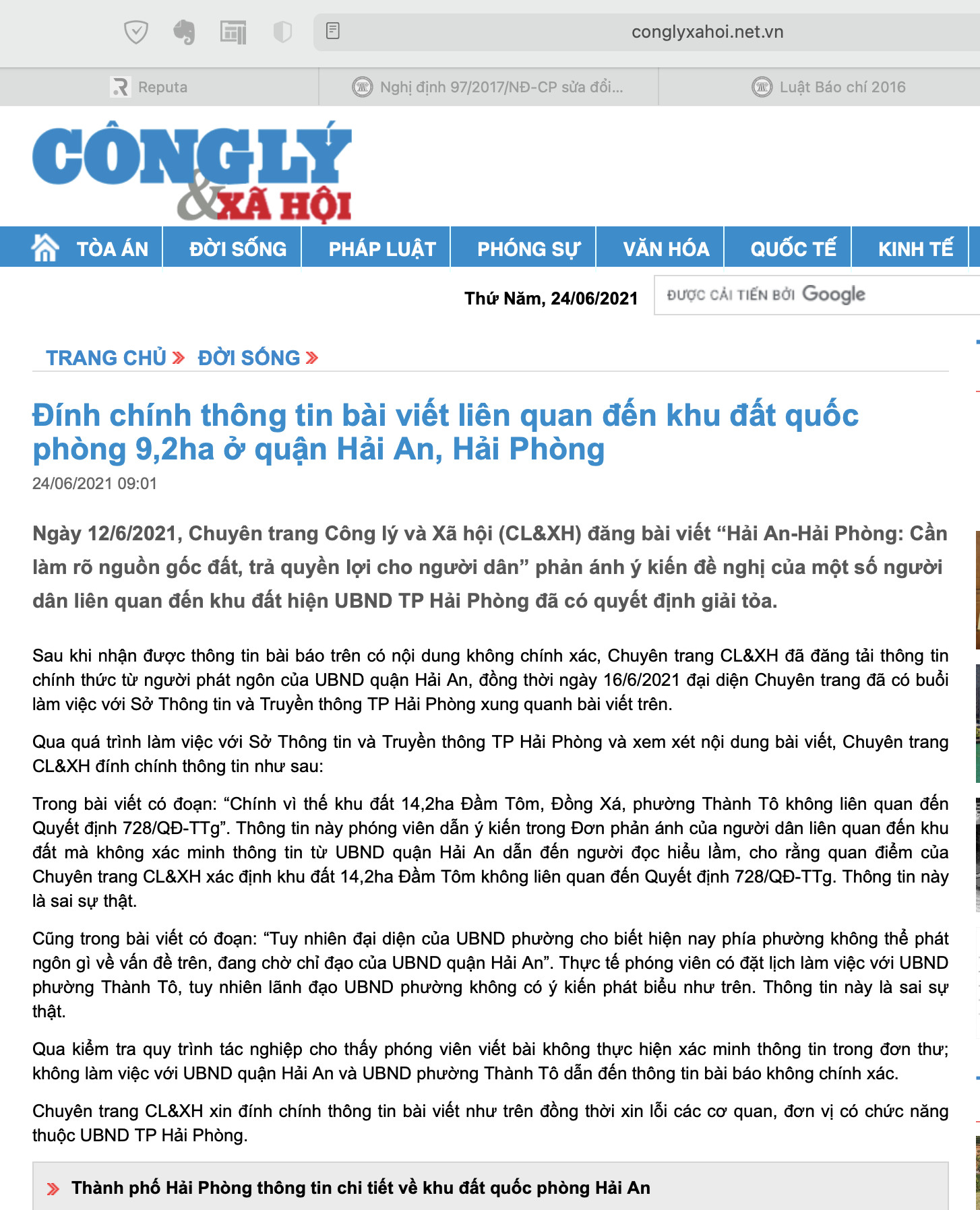 Trước đó, ngày 12/6/2021, Chuyên trang Công lý và Xã hội của Báo điện tử Công lý đã đăng tải bài viết “Hải An-Hải Phòng: Cần làm rõ nguồn gốc đất, trả quyền lợi cho người dân”. Sở Thông tin và Truyền thông Hải Phòng đã làm việc với các cơ quan chức năng liên quan và đại diện Báo Công lý để xác định các hành vi sai phạm. Quá trình làm việc với Sở Thông tin và Truyền thông Hải Phòng, Báo Công lý đã tiếp thu, thừa nhận hành vi vi phạm và thực hiện gỡ bỏ bài viết có nội dung thông tin sai sự thật, đồng thời đăng bài viết đính chính, xin lỗi.