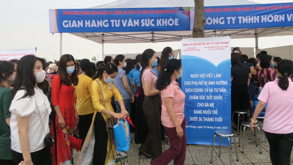 Sáng 25/4, tại khu đô thị Seoul Ecohome – Khu công nghiệp Tràng Duệ, Hội Liên hiệp Phụ nữ Hải Phòng phối hợp với Công đoàn Khu kinh tế thành phố tổ chức Ngày hội việc làm cho phụ nữ bị ảnh hưởng bởi dịch COVID-19 và tư vấn chăm sóc sức khoẻ cho bà mẹ đang nuôi con dưới 36 tháng tuổi.