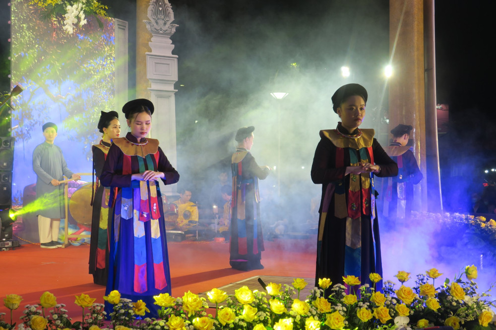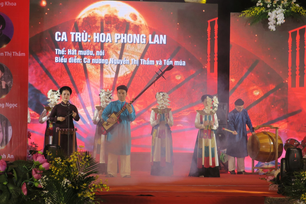 Ca nương Nguyễn Thị Thắm và Tốp múa thể hiện tiết mục Hát Ca trù “Hoa Phong Lan”.