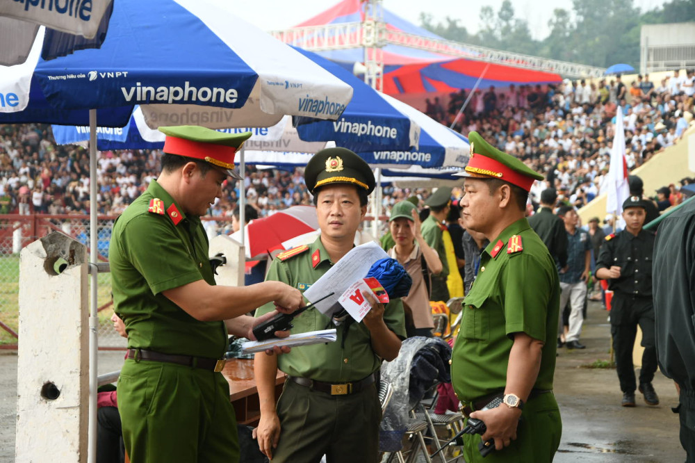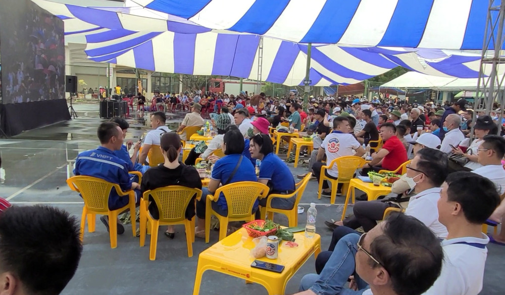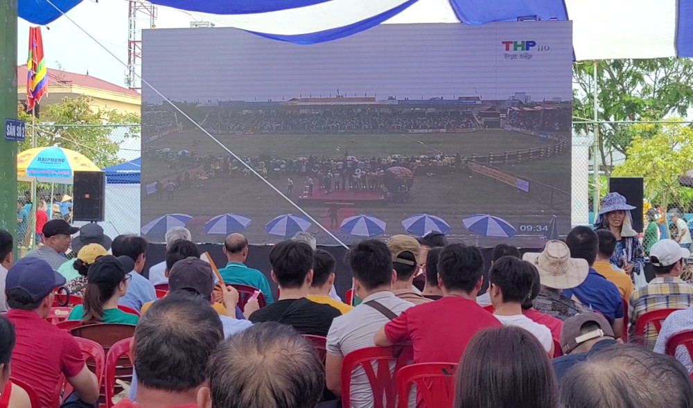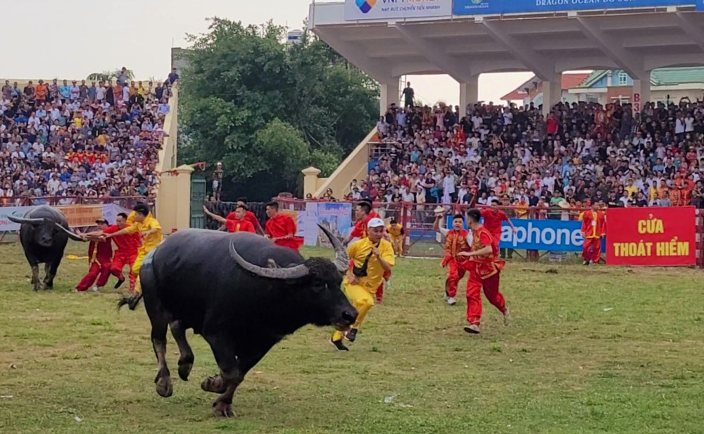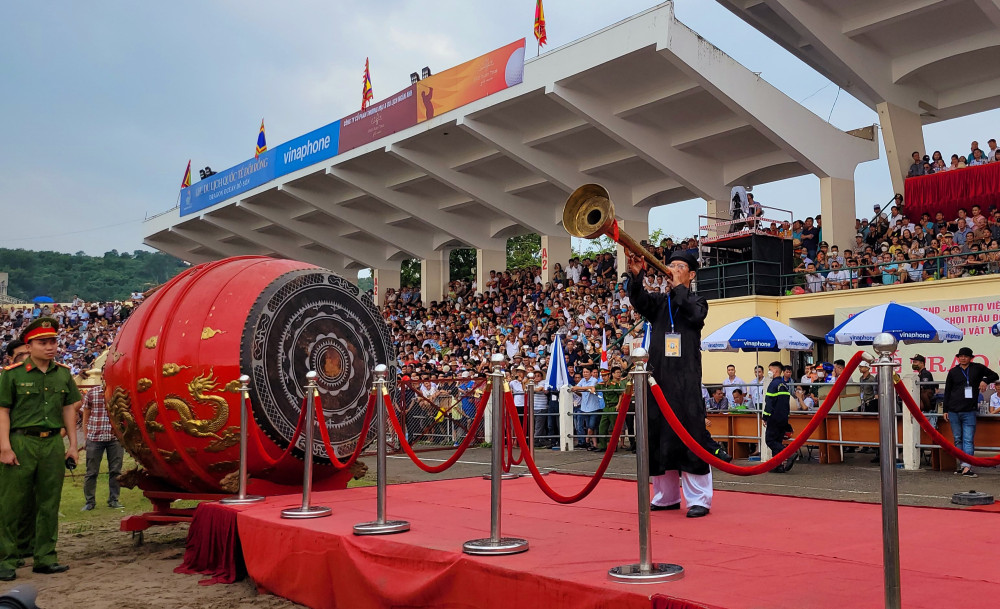 Chỉ khoảng 7h cùng ngày, các khán đài đã chật kín người tới xem chọi trâu. Các khán đài C, D được Ban tổ chức chuẩn bị tấm bạt lớn làm mái che, thuận lợi cho người dân theo dõi 15 trận đấu của các “ông trâu“.