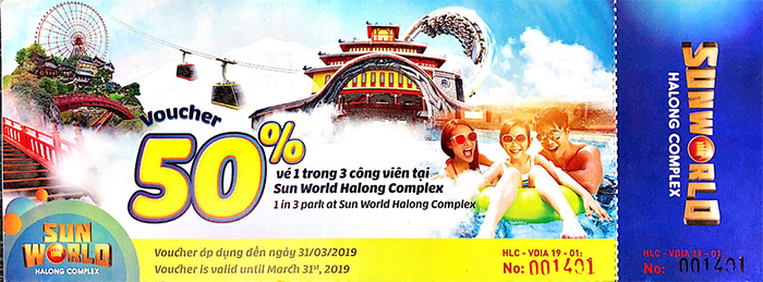 Ngoài ra, nếu đến và đi từ Cảng hàng không quốc tế Vân Đồn từ 01/04/2019- 31/12/2019, hành khách sẽ được nhận 01 voucher giảm 20% giá vé tham quan một trong ba công viên của tổ hợp vui chơi giải trí Sun World Halong Complex là Cáp treo Nữ Hoàng, Công viên chủ đề Dragon Park hoặc công viên nước Typhoon Water Park. Voucher được áp dụng trong vòng 10 ngày, kể từ ngày khách đến sân bay, ngày đến thể hiện trên vé máy bay. Voucher không có giá trị quy đổi tiền mặt và không được mua bán.