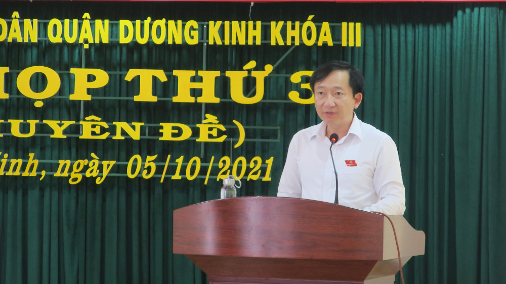Theo đó, đồng chí Nguyễn Trí Nhân, Phó Chủ tịch UBND quận trình bày các tờ trình liên quan đến một số nội dung quan trọng như: điều chỉnh, phân bổ chi tiết vốn cho 2 dự án Xây dựng công viên cây xanh tại Tổ dân phố số 5, phường Hưng Đạo và Tổ dân phố số 3, phường Hải Thành; chủ trương đầu tư xây dựng hầm Trung tâm chỉ huy trong căn cứ chiến đấu quận Dương Kinh, trường THCS Hưng Đạo, dãy nhà 2 tầng gồm hội trường nhà văn hóa và các phòng làm việc UBND phường Hải Thành; Trường mầm non Trung tâm phường Hòa Nghĩa (giai đoạn 2); Nhà văn hóa Quảng Luận, phường Đa Phúc; đường 25m tại phường Hưng Đạo (đoạn từ đường Phúc Lộc qua trường THCS Hưng Đạo kết nối ngõ đi đường 355).
