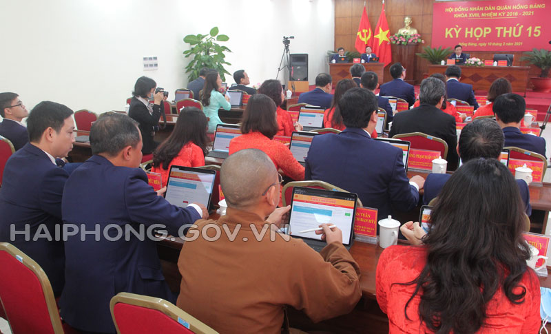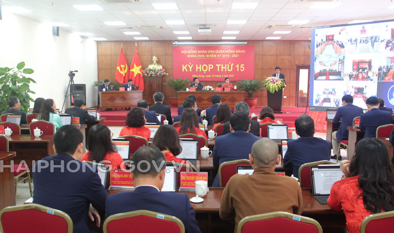 Sáng 10/3, HĐND quận Hồng Bàng khóa XVIII tổ chức kỳ họp thứ 15 bằng hình thức họp trực tuyến với 9 điểm cầu các phường, nhằm đánh giá kết quả thực hiện nhiệm kỳ 2016-2021; đề ra phương hướng, nhiệm vụ giải pháp nhiệm kỳ 2021-2026.
