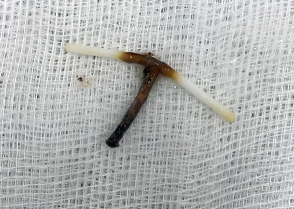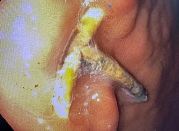 Tại Bệnh viện, qua thăm khám và hội chẩn, người bệnh được chỉ định nội soi thực quản-dạ dày-tá tràng và phát hiện có dị vật dạng dụng cụ tử cung cắm vào dạ dày. Qua hội chẩn, để sáng tỏ hơn nhằm đưa ra phương án xử lý, người bệnh được chụp CT scanner cho thấy dị vật này đâm xuyên thành dạ dày.