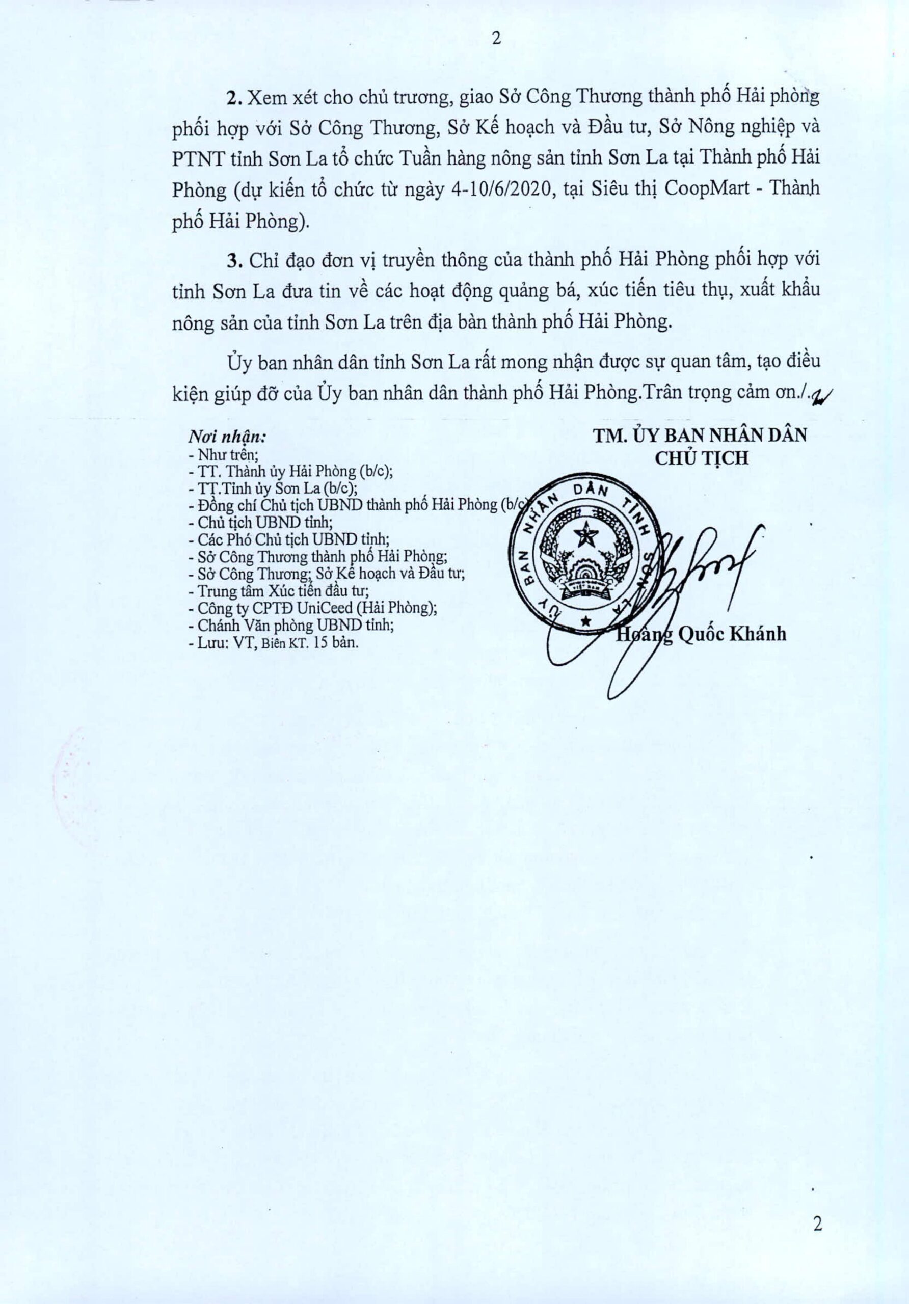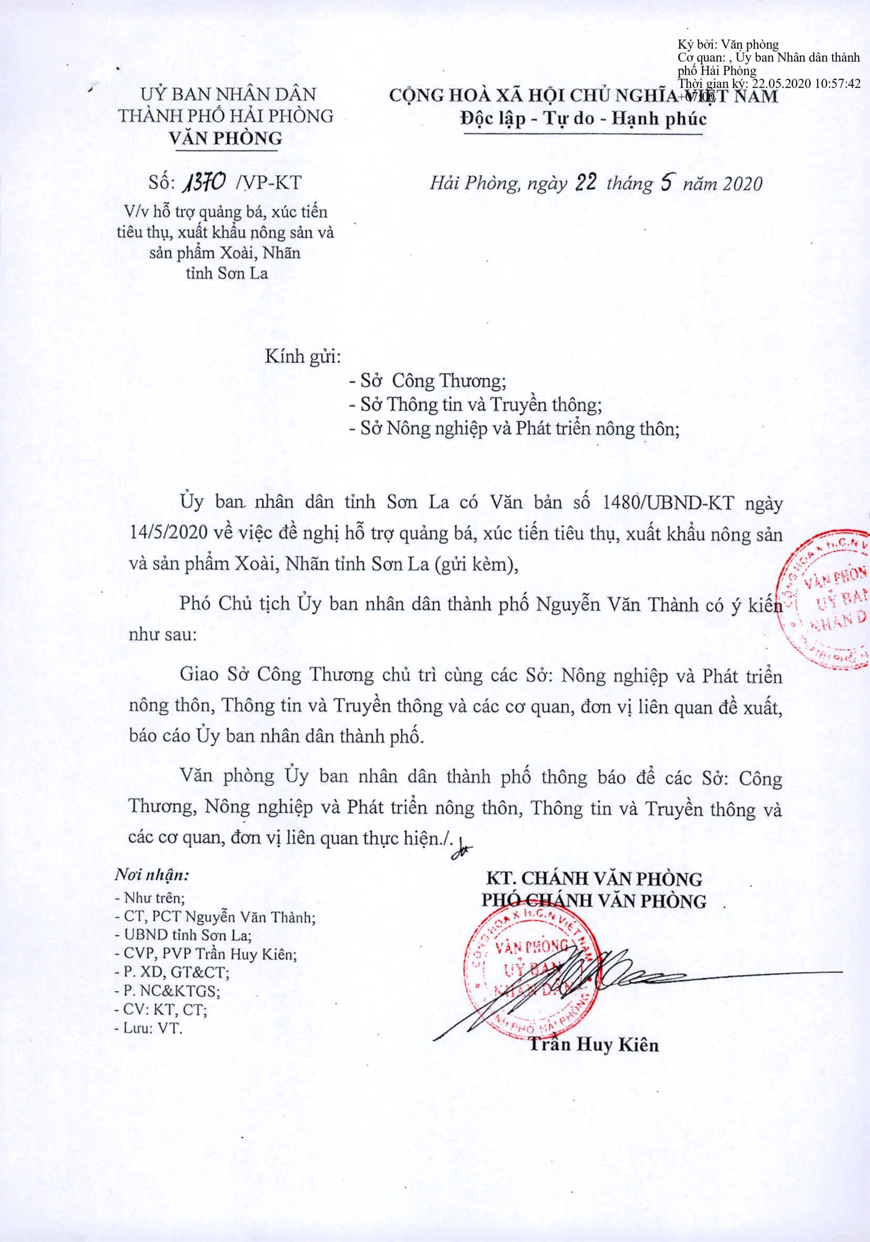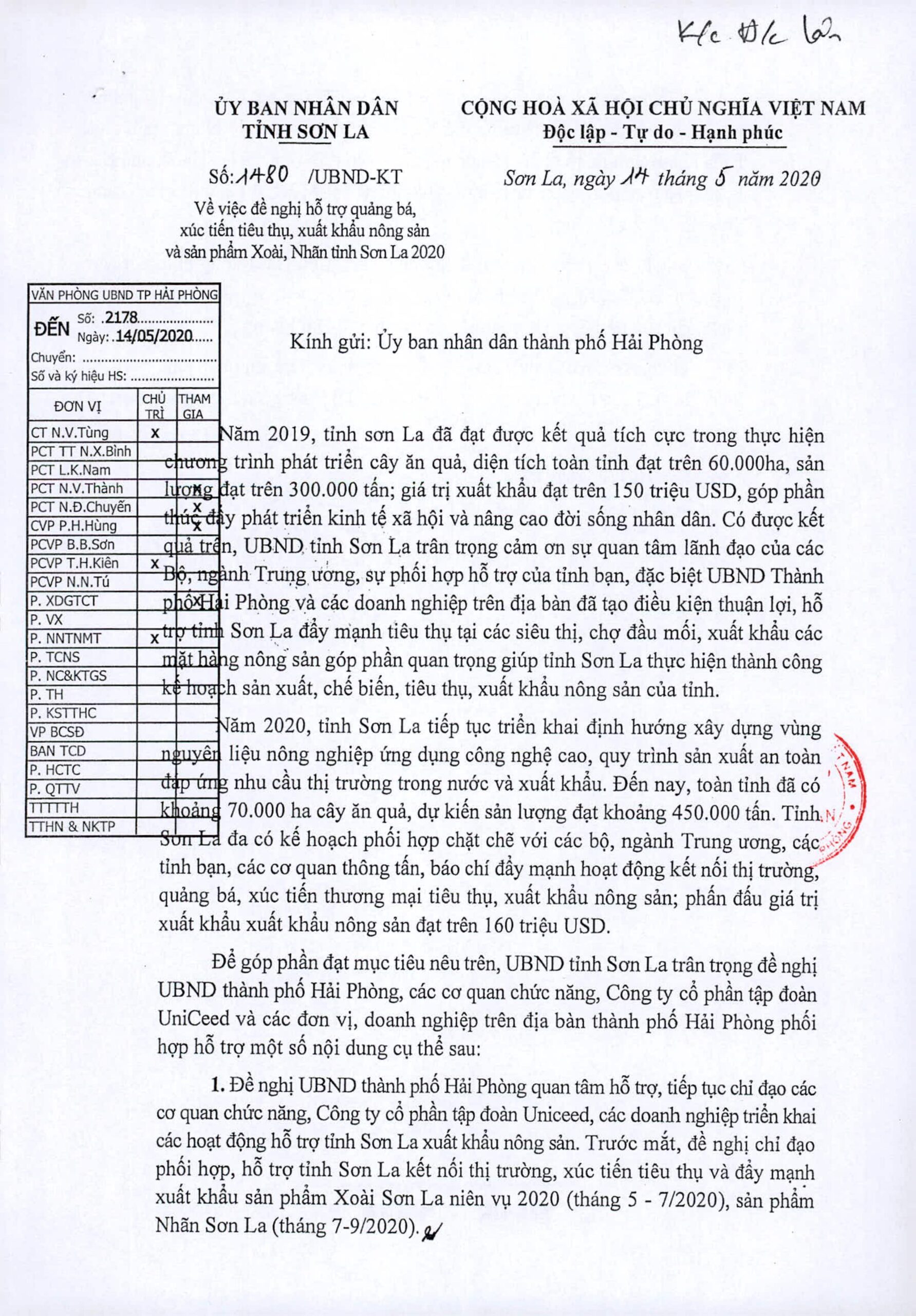 Ngày 14/5/2020, Ủy ban nhân dân tỉnh Sơn La có Văn bản số 1480/UBND-KT về việc đề nghị hỗ trợ quảng bá, xúc tiến tiêu thụ, xuất khẩu nông sản và sản phẩm Xoài, Nhãn tỉnh Sơn La.