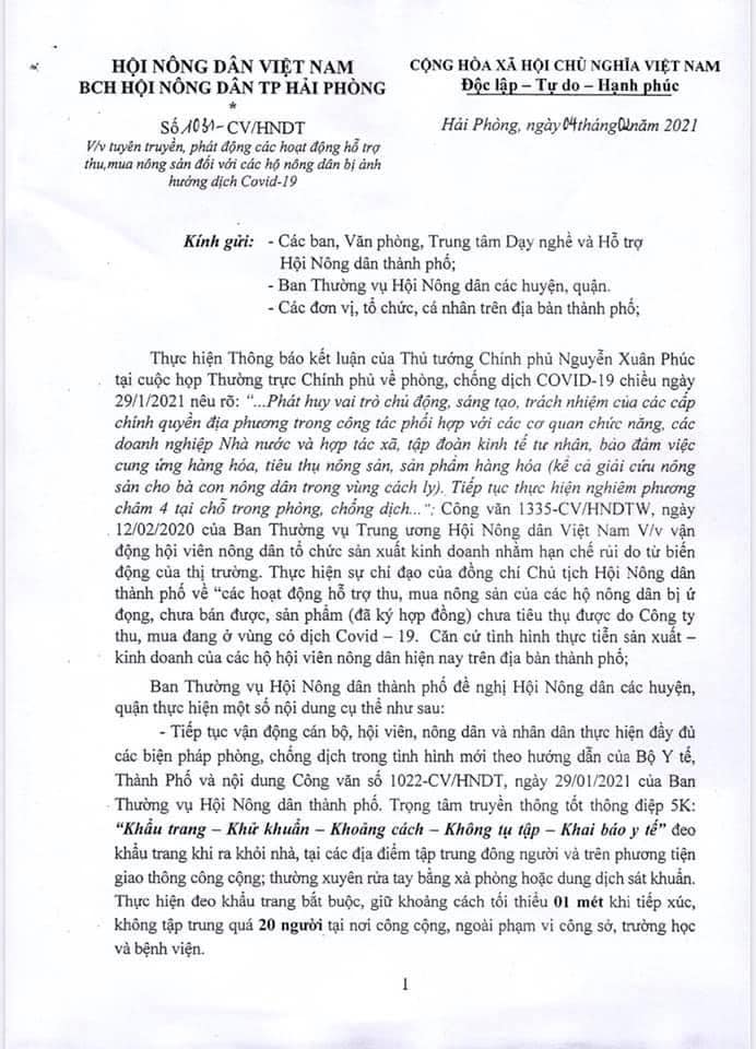 Hội Nông dân thành phố Hải Phòng vừa có văn bản tuyên truyền, phát động các hoạt động hỗ trợ thu, mua nông sản đối với các hộ nông dân bị ảnh hưởng của dịch COVID-19.
