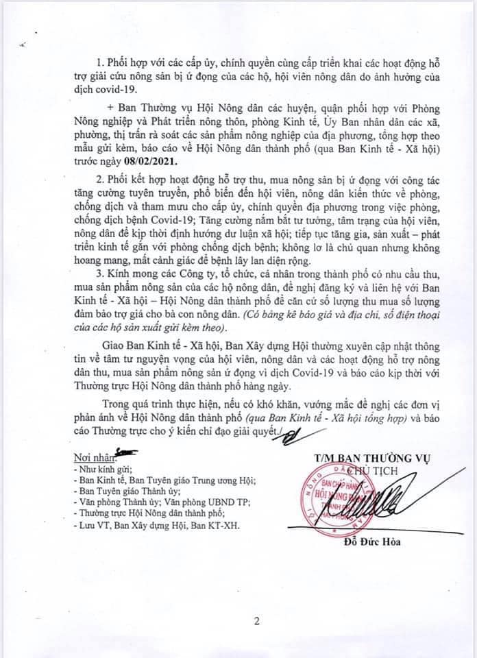 Theo đó, Hội Nông dân các huyện, quận phối hợp với các cấp ủy, chính quyền cùng cấp triển khai các hoạt động hỗ trợ giải cứu nông sản bị ứ đọng của các hộ, hội viên nông dân do ảnh hưởng của dịch Covid-19. Ban Thường vụ Hội Nông dân các huyện, quận phối hợp với Phòng Nông nghiệp và Phát triển nông thôn, phòng Kinh tế, Ủy ban nhân dân các xã, phường, thị trấn rà soát các sản phẩm nông nghiệp của địa phương, tổng hợp theo mẫu gửi kèm, báo cáo về Hội nông dân thành phố (qua Ban Kinh tế – Xã hội) trước ngày 08/02/2021.