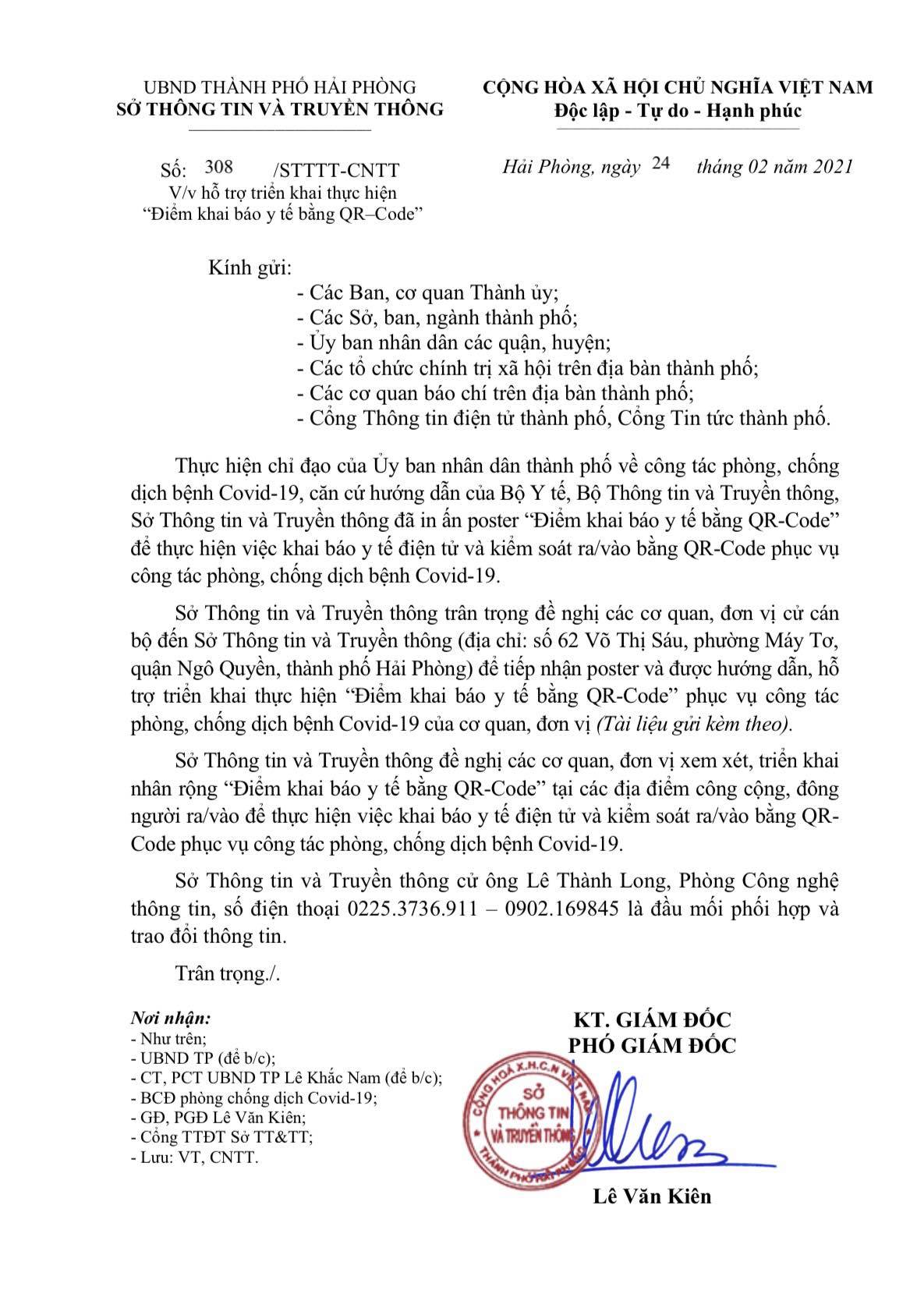 Sở Thông tin và Truyền thông đề nghị các cơ quan, đơn vị cử cán bộ đến Sở Thông tin và Truyền thông (địa chỉ: số 62 Võ Thị Sáu, phường Máy Tơ, quận Ngô Quyền, thành phố Hải Phòng) để tiếp nhận poster và được hướng dẫn, hỗ trợ triển khai thực hiện “Điểm khai báo y tế bằng QR-Code” phục vụ công tác phòng, chống dịch bệnh Covid-19 của cơ quan, đơn vị.