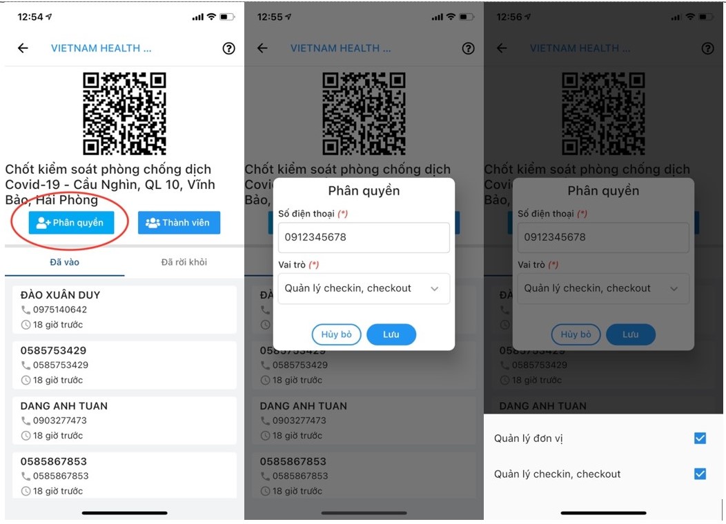 Người quản lý điểm kiểm dịch truy cập vào website https://tokhaiyte.vn hoặc ứng dụng Vietnam Health Declaration -> chọn tên điểm kiểm dịch -> bấm Phân quyền -> nhập số điện thoại của người được phân quyền và chọn 01 trong 02 quyền tương ứng -> bấm Lưu.