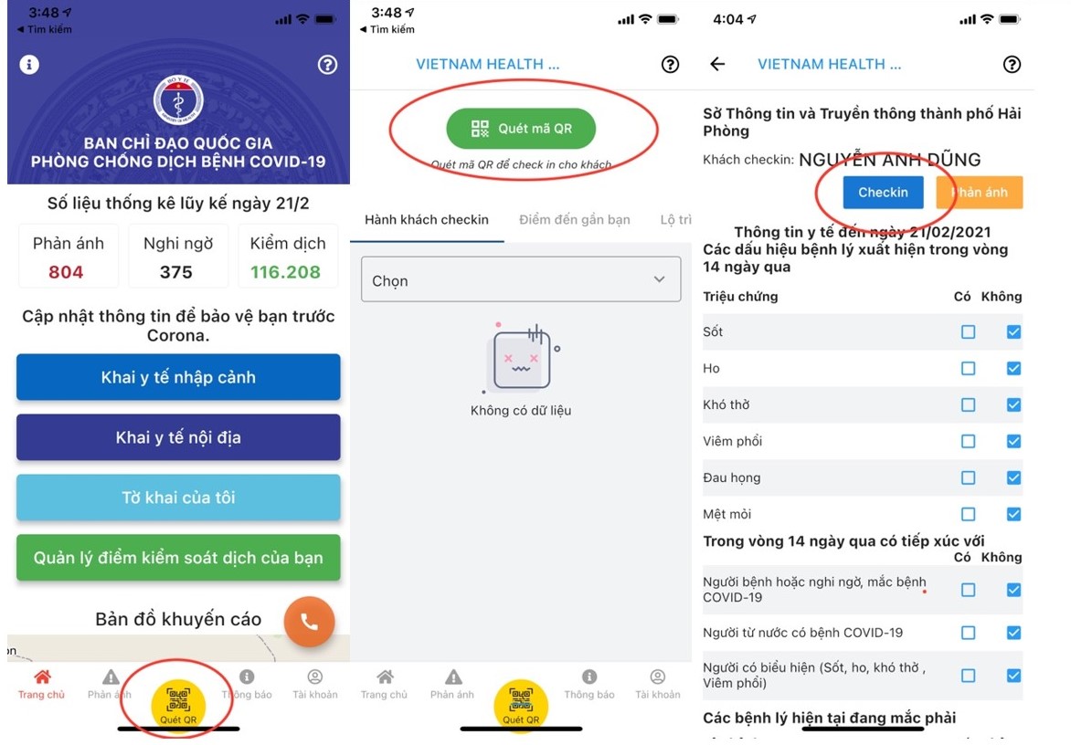 Bước 1:Người trực ca tại điểm kiểm dịch đề nghị công dân sử dụng ứng dụng Vietnam Health Declaration quét mã QR-code đã được niêm yết để khai báo vào/ra tại điểm kiểm dịch. Thông tin của công dân sẽ được cập nhật ngay vào danh sách của điểm kiểm dịch.
