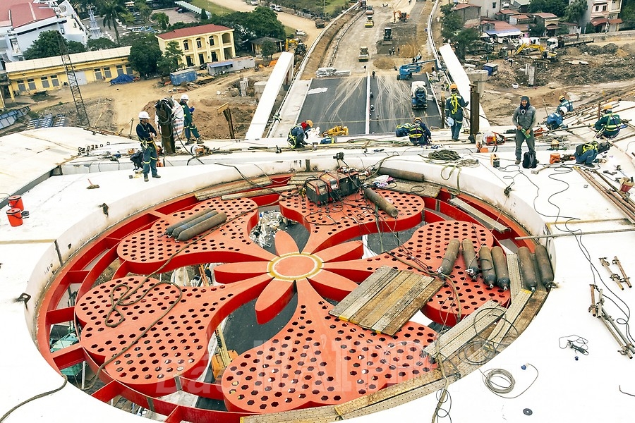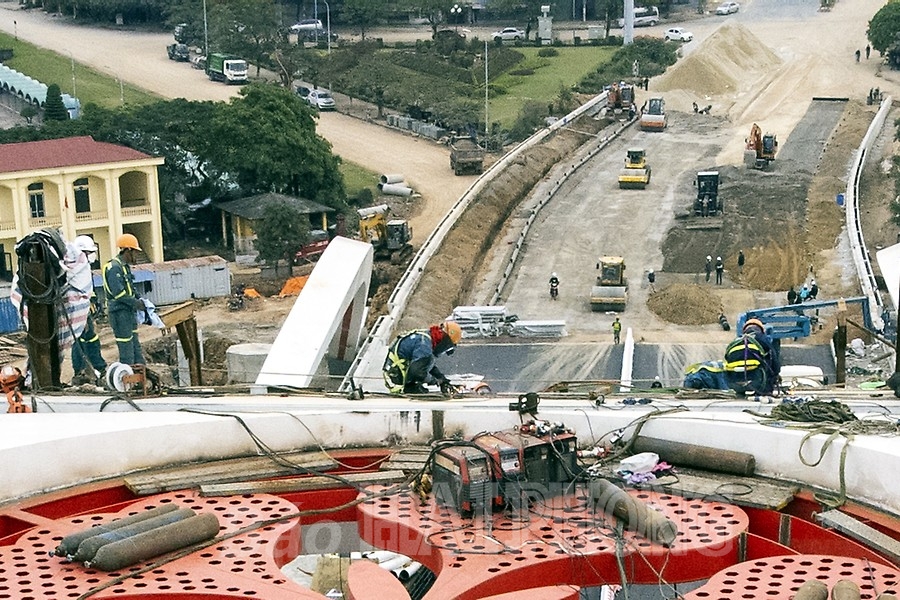 Theo Ban điều hành dự án thi công cầu Rào, chiều ngày 11/1/2022, các nhà thầu thực hiện xong hạng mục gác chùm 3 bộ khung cánh hoa phượng đỏ lên đỉnh vòm cầu Rào.
