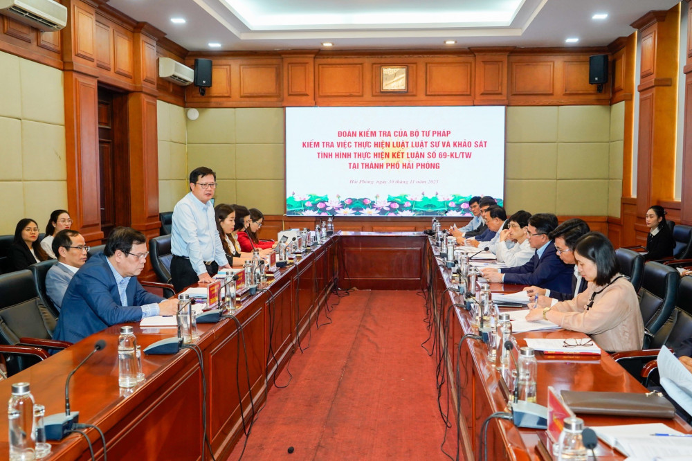 Tiếp thu ý kiến của Thứ trưởng Bộ Tư pháp tại cuộc họp, Phó Chủ tịch UBND thành phố Lê Khắc Nam cho biết, kể từ khi Luật Luật sư có hiệu lực và Ban Bí thư ban hành Kết luận số 69-KL/TW; Ban Thường vụ Thành ủy đã ban hành Chỉ thị số 29-CT/TU ngày 05/6/2023 về việc thực hiện Kết luận số 69-KL/TW của Ban Bí thư; UBND thành phố ban hành Kế hoạch số 181/KH-UBND ngày 08/7/2020 về việc triển khai thực hiện Chỉ thị số 29-CT/TU của Ban Thường vụ Thành ủy. Thành phố Hải Phòng đã có những chuyển biến tích cực, đội ngũ luật sư đã có bước phát triển cả về số lượng và chất lượng. Hoạt động hành nghề luật sư đã có bước phát triển theo hướng chuyên nghiệp, hiệu quả; tích cực tham gia trợ giúp pháp lý cho người nghèo và các đối tượng chính sách. Số lượng vụ việc có luật sư tham gia có xu hướng gia tăng, chất lượng pháp lý ngày càng được cải thiện. Phó Chủ tịch UBND thành phố yêu cầu Sở Tư pháp, Hội Luật gia, Đoàn luật sư và các cơ quan, đơn vị, địa phương nêu cao tinh thần chủ động, sáng tạo, phát huy hơn nữa vai trò trách nhiệm kịp thời tham mưu, đề xuất với thành phố trong tổ chức thực hiện Luật Luật sư và Kết luận số 69-KL/TW của Ban Bí thư để đạt được nhiều kết quả tốt hơn. Giao Sở Tư pháp tiếp thu ý kiến chỉ đạo, tham gia của Đoàn kiểm tra hoàn thiện báo cáo, cung cấp hồ sơ, tài liệu theo yêu cầu của Đoàn kiểm tra.