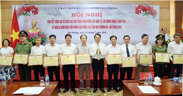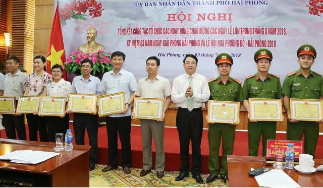 Chiều 3-7, UBND thành phố tổng kết công tác tổ chức các hoạt động chào mừng các ngày lễ lớn trong tháng 5 và kỷ niệm 63 năm Ngày giải phóng Hải Phòng và Lễ hội Hoa Phượng Đỏ – Hải Phòng 2018. Đến dự có đồng chí Lê Khắc Nam, Phó chủ tịch UBND thành phố.
