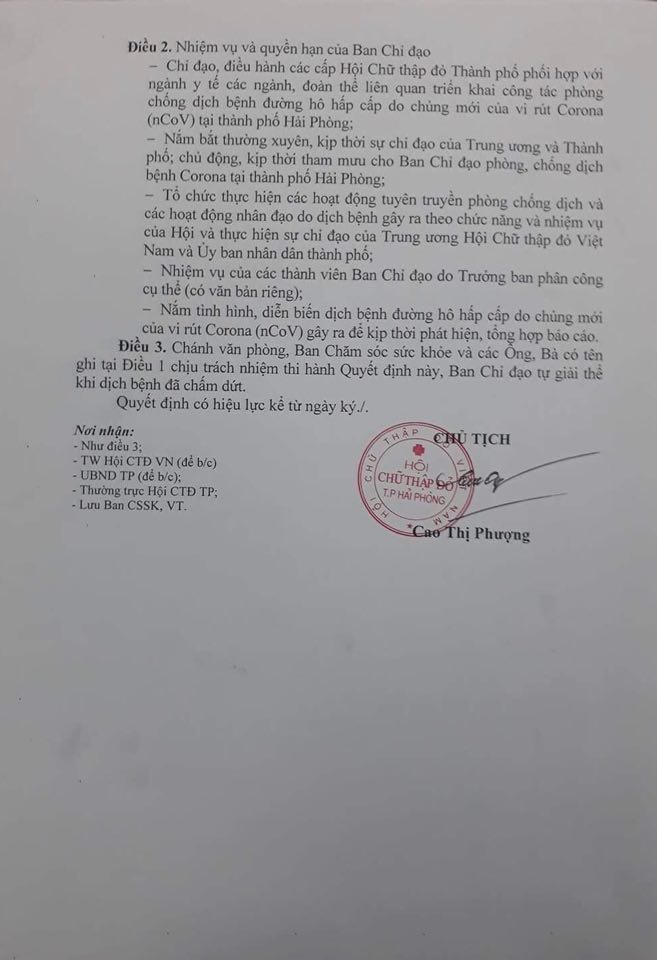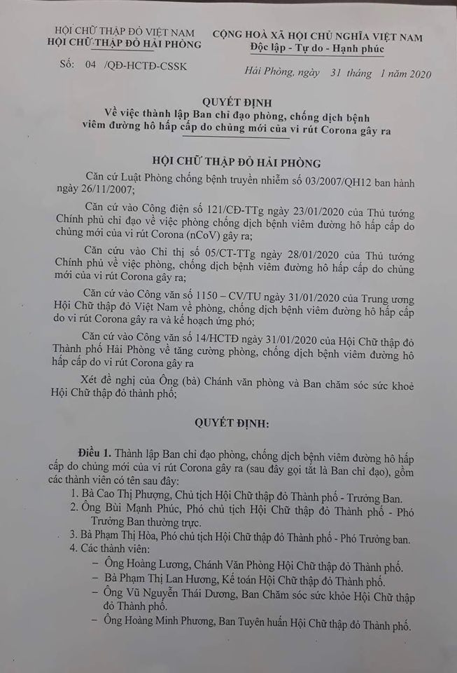 Trước tình trạng diễn biến phức tạp của dịch viêm đường hô hấp cấp do chủng mới của vi rút Corona (nCoV) gây ra, Hội Chữ thập đỏ thành phố Hải Phòng vừa có Quyết định thành lập Ban Chỉ đạo phòng, chống dịch bệnh viêm đường hô hấp cấp do chủng mới của vi rút Corona gây ra.