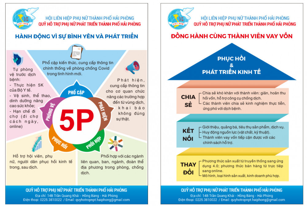 Cùng với việc tuyên truyền thông điệp “5K” của Bộ Y tế, các cấp Hội LHPN thành phố Hải Phòng đã sáng tạo inforgraphic tuyên truyền phòng, chống dịch COVID-19 với chủ đề “Hành động vì sự bình yên và phát triển” theo thông điệp “5P”. (5P là: Phòng vệ, Phổ cập, Phát hiện, Phối hợp, Phục hồi).