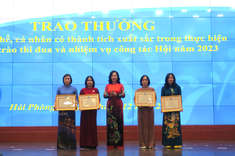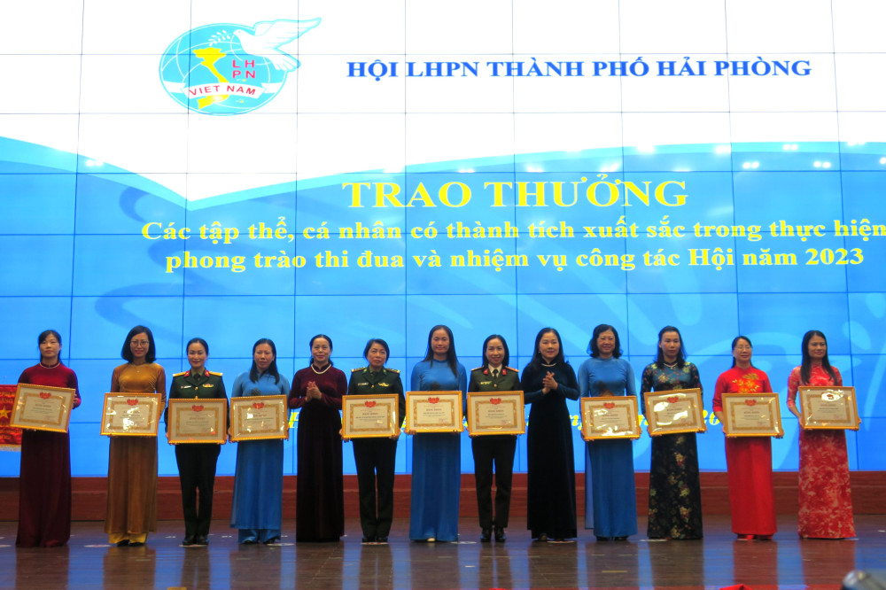 Ghi nhận những kết quả từ sự nỗ lực của đội ngũ cán bộ, hội viên phụ nữ thành phố, năm 2023, Trung ương Hội LHPN Việt Nam đã tặng Cờ thi đua xuất sắc cho tập thể cán bộ, hội viên, phụ nữ thành phố Hải Phòng; tặng Bằng khen cho 42 tập thể, 05 cá nhân, tặng khen Kỷ niệm chương “Vì sự phát triển của phụ nữ Việt Nam” cho 107 cá nhân. Hội LHPN thành phố tặng Bằng khen cho 78 tập thể, 85 cá nhân, biểu dương 40 Chi hội trưởng tiêu biểu. Đặc biệt, chị Lê Thị Guốt, hội viên phụ nữ huyện Tiên Lãng được vinh danh Giải thưởng Kova; chị Lê Thị Hương Giang, Phòng Cảnh sát hình sự, Công an thành phố được vinh danh Giải thưởng Phụ nữ Việt Nam.