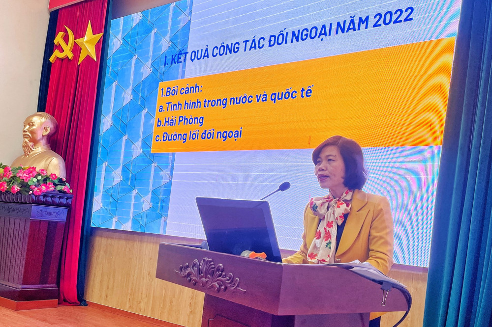 Tại Hội nghị, báo cáo viên các cấp được đồng chí Nguyễn Thị Bích Dung, Giám đốc Sở Ngoại vụ đã tới dự và thông tin với Hội nghị một số kết quả nổi bật về công tác đối ngoại của thành phố năm 2022; phương hướng, nhiệm vụ năm 2023. Hoạt động đối ngoại, hội nhập quốc tế, liên kết vùng tiếp tục đẩy mạnh, thiết thực và hiệu quả; hình ảnh, vị thế và uy tín của Hải Phòng được nâng cao rõ nét. Tăng cường triển khai củng cố, mở rộng quan hệ hợp tác hữu nghị với các nước, các tổ chức quốc tế, địa phương và vùng lãnh thổ trên thế giới, chú trọng các đối tác: Nhật Bản, Hàn Quốc, EU, Hoa Kỳ, các địa phương trong Hai hành lang, một vành đai kinh tế Việt Nam-Trung Quốc.