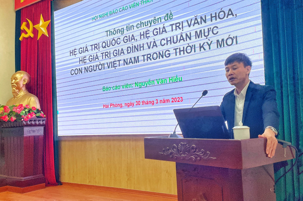 Đồng chí Nguyễn Văn Hiểu, Phó Trưởng Ban Tuyên giáo Thành ủy đã giới thiệu các nội dung về hệ giá trị Quốc gia, Hệ giá trị văn hóa, Hệ giá trị gia đình, tiêu chuẩn con người Việt Nam. Việc nghiên cứu, xây dựng và triển khai thực hiện các hệ giá trị này có vai trò, ý nghĩa rất quan trọng để phát huy giá trị văn hóa và sức mạnh con người Việt Nam trong xây dựng và bảo vệ Tổ quốc, phát triển đất nước phồn vinh, hạnh phúc trong giai đoạn tới.