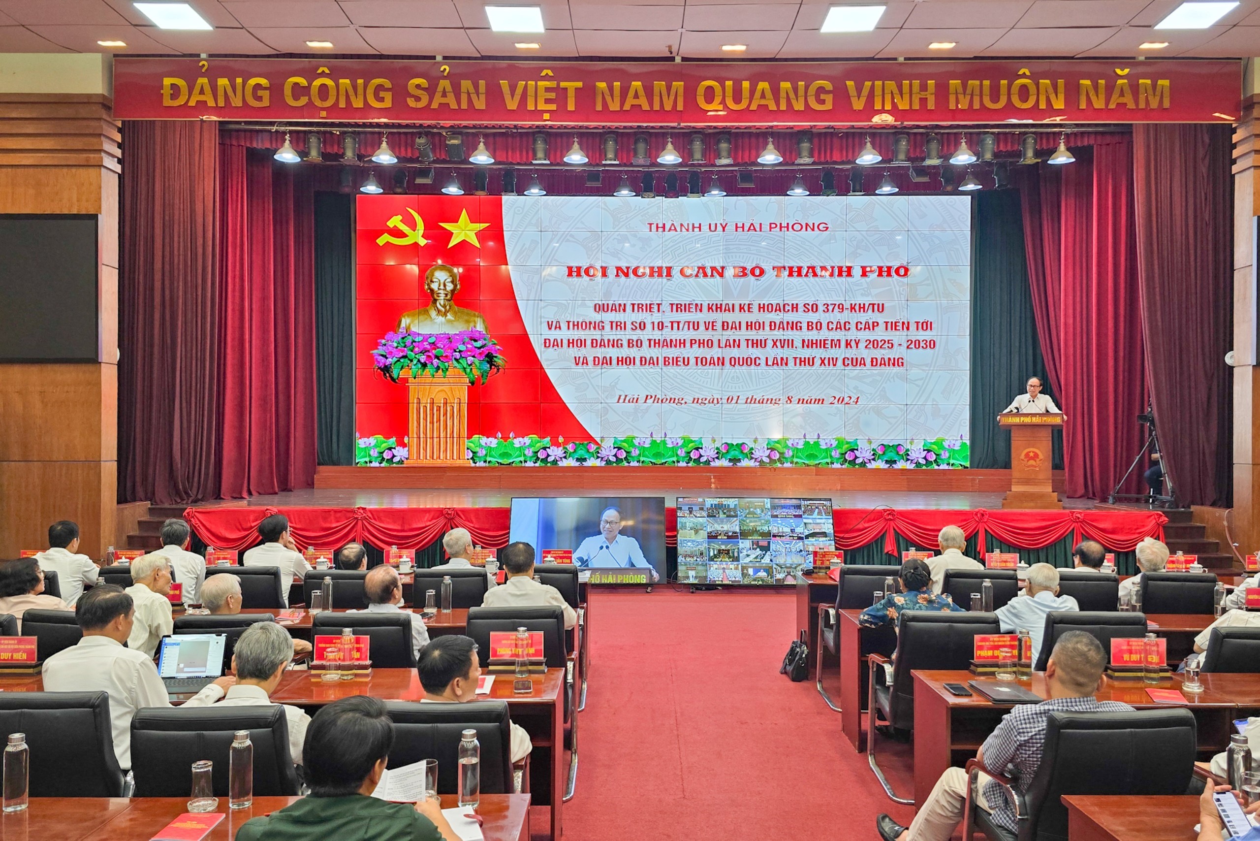 Chiều 01/8, Thành ủy Hải Phòng tổ chức Hội nghị quán triệt, triển khai Kế hoạch số 379-KH/TU, ngày 17/7/2024 của Ban Chấp hành Đảng bộ thành phố và Thông tri số 10-TT/TU của Ban Thường vụ Thành ủy về Đại hội Đảng bộ các cấp tiến tới Đại hội Đảng bộ thành phố lần thứ XVII, nhiệm kỳ 2025 – 2030 và Đại hội đại biểu toàn quốc lần thứ XIV của Đảng. Đồng chí Lê Tiến Châu, Ủy viên Trung ương Đảng, Bí thư Thành ủy, Trưởng Đoàn đại biểu Quốc hội Hải Phòng chủ trì Hội nghị.