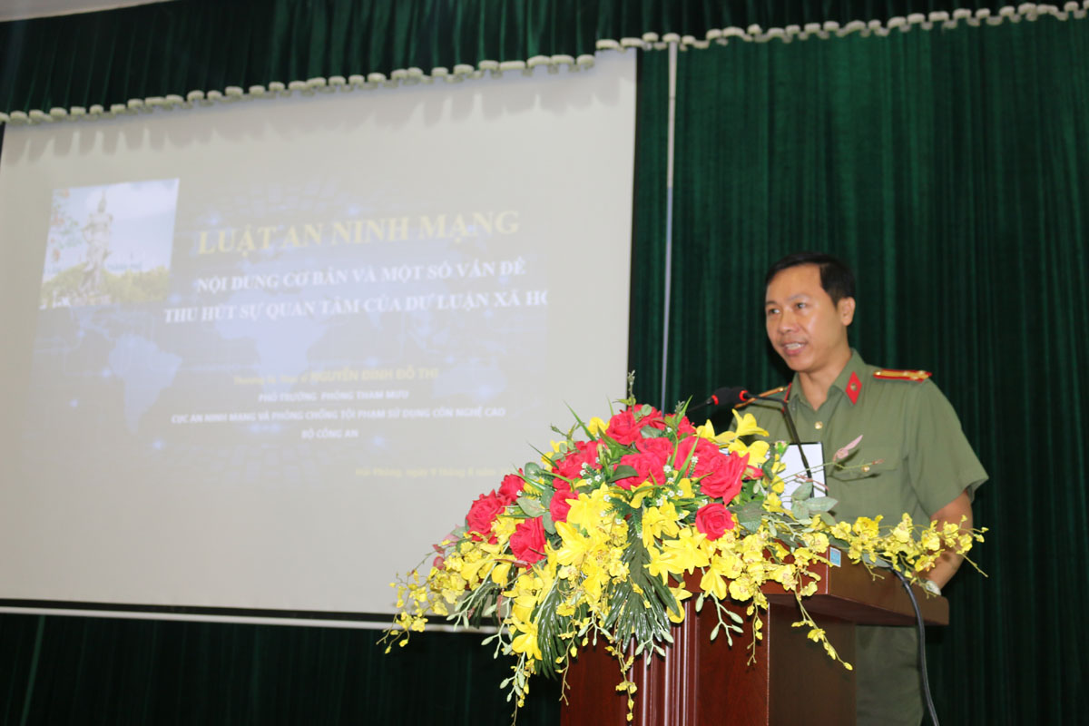 Trong buổi tập huấn, đồng chí Thượng tá, Nguyễn Đình Đỗ Thi – Phó Trưởng phòng Tham mưu, Cục An ninh mạng và phòng, chống tội phạm sử dụng công nghệ cao – Bộ Công an trình bày chuyên đề “ Luật An ninh mạng, nội dung cơ bản và một số vấn đề thu hút sự quan tâm của dư luận xã hội”