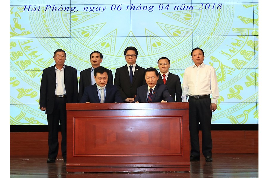 Các đồng chí lãnh đạo Bộ Tài chính, Phòng Thương mại và Công nghiệp Việt Nam chứng kiến lễ ký kết phối hợp tuyên truyền giữa Đài Phát thanh và Truyền hình Hải Phòng và Chi nhánh Phòng Thương mại và Công nghiệp Việt Nam tại Hải Phòng. Ảnh: Duy Thính