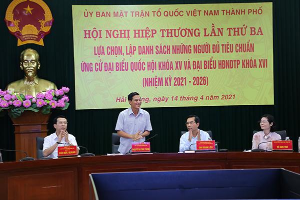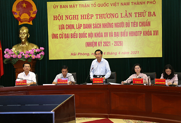 Sáng 14/4, tại Trung tâm Hội nghị thành phố, Ủy ban Mặt trận Tổ quốc Việt Nam (MTTQVN) thành phố tổ chức Hội nghị hiệp thương lần thứ Ba để lựa chọn, lập danh sách những người đủ tiêu chuẩn ứng cử đại biểu Quốc hội khóa XV tại thành phố Hải Phòng và Hội đồng nhân dân (HĐND) thành phố khóa XVI (nhiệm kỳ 2021-2026).