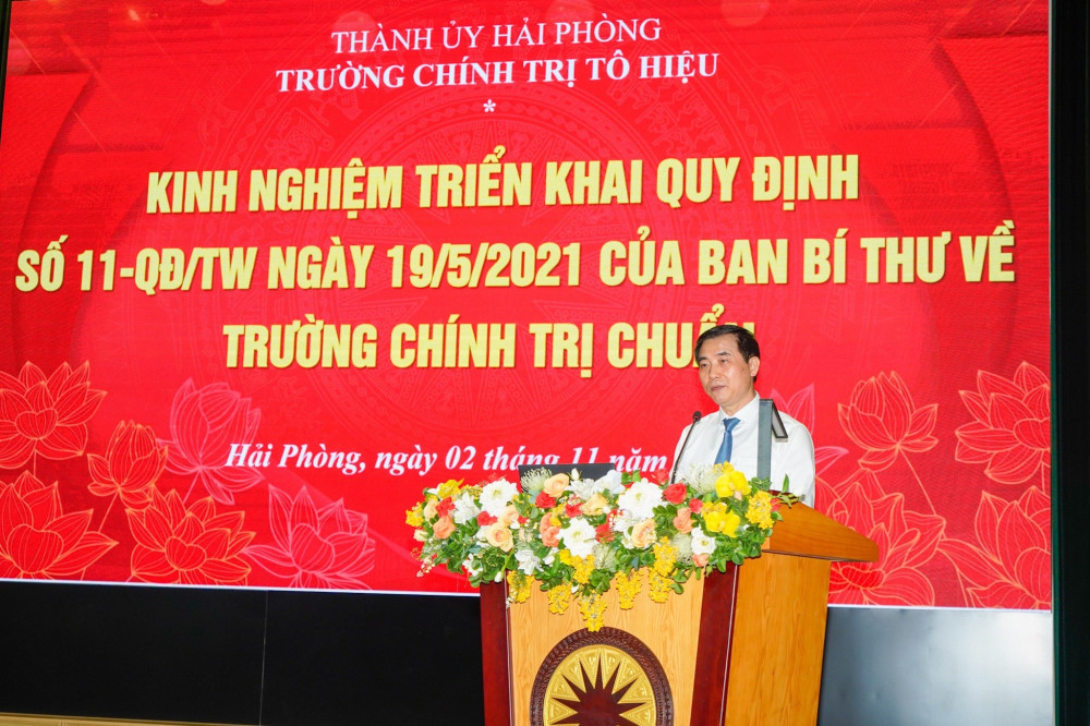 Tại Hội nghị, đồng chí Nguyễn Kim Pha, Hiệu trưởng Trường Chính trị Tô Hiệu trao đổi kinh nghiệm triển khai Quy định số 11-QĐ/TW của Ban Bí thư về trường chính trị chuẩn. Trong đó, nhấn mạnh, yếu tố quyết tâm, phát huy truyền thống đoàn kết trong toàn thể đội ngũ cán bộ, viên chức và người lao động, từ đó, tạo lên sự đồng thuận, động viên mọi người tích cực tham gia, phát huy nỗ lực để tạo ra những đột phá trong xây dựng và phát triển nhà trường. Đồng thời, phát huy trách nhiệm của cả hệ thống chính trị trong công tác xây dựng trường chính trị chuẩn, nhất là trường chủ động gửi Đề án đến các Sở, ban, ngành liên quan tham gia ý kiến, phối hợp ngay từ đầu trong quá trình xây dựng,cũng như tạo tiền đề cho phối hợp thực hiện Đề án sau này. Hiện, toàn thể cán bộ, giảng viên, viên chức Trường Chính trị Tô Hiệu quyết tâm phấn đấu sớm đưa trường trở thành trường chính trị đầu tiên trong hệ thống các trường chính trị trong cả nước đạt chuẩn mức 2 vào năm 2025.