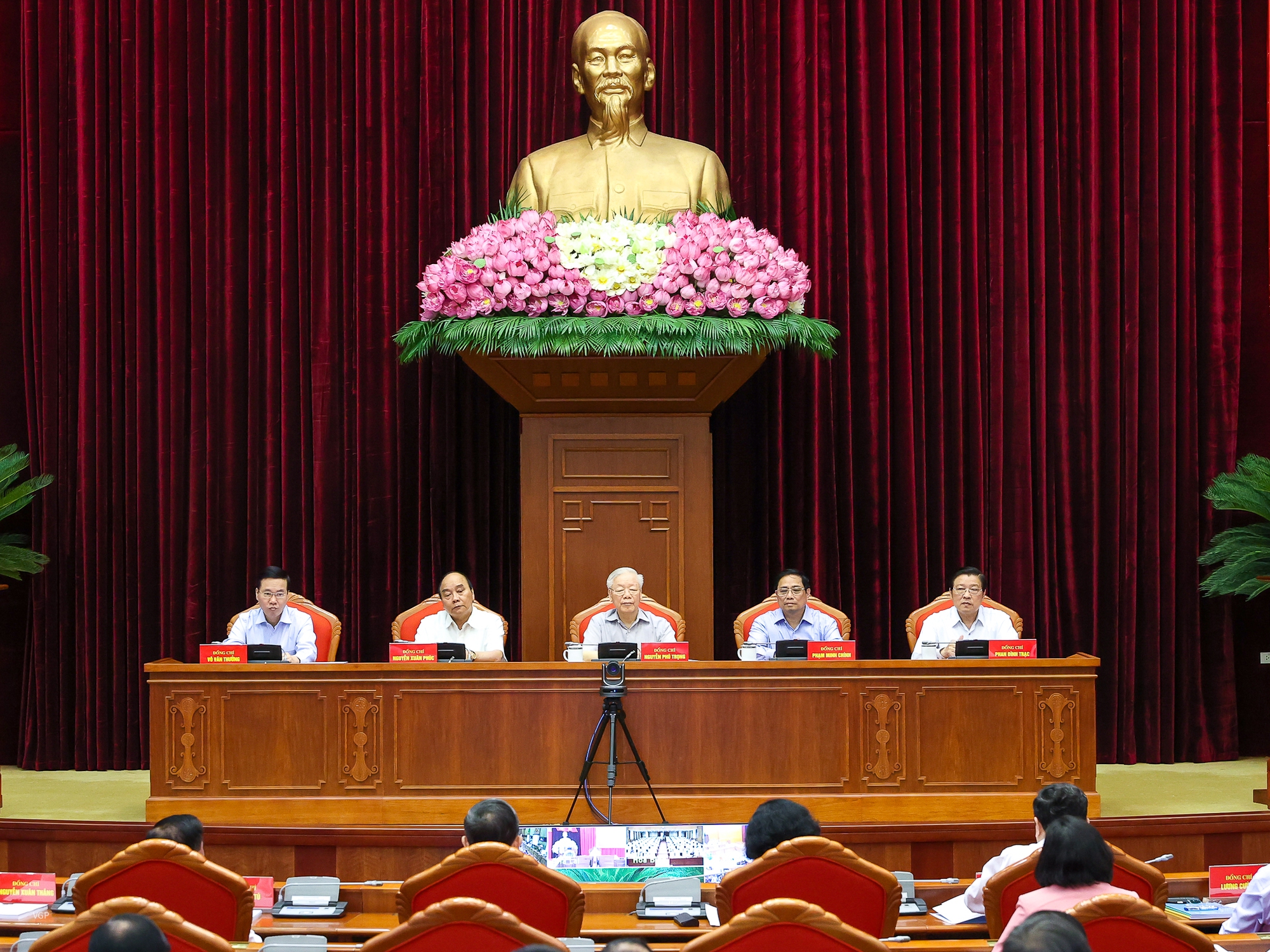 Tổng Bí thư Nguyễn Phú Trọng, Chủ tịch nước Nguyễn Xuân Phúc, Thủ tướng Chính phủ Phạm Minh Chính, Thường trực Ban Bí thư Võ Văn Thưởng, Trưởng Ban Nội chính Trung ương Phan Đình Trạc đồng chủ trì hội nghị.