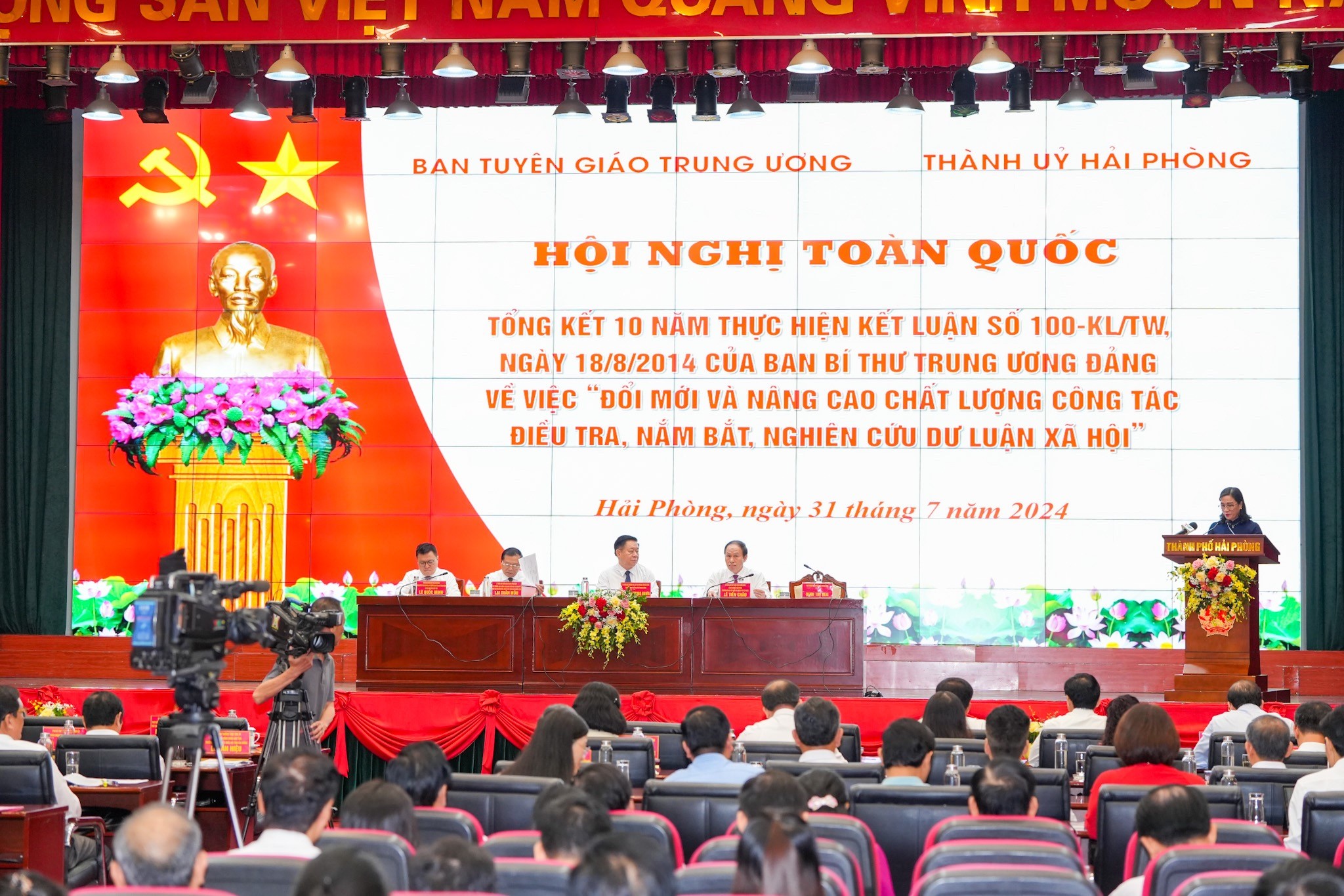 Sáng 31/7, tại Trung tâm Hội nghị thành phố, Ban Tuyên giáo Trung ương phối hợp với Thành ủy Hải Phòng tổ chức Hội nghị toàn quốc tổng kết 10 năm thực hiện Kết luận số 100-KL/TW, ngày 3/8/2014 của Ban Bí thư (khóa XI) về việc “Đổi mới và nâng cao chất lượng công tác điều tra, nắm bắt, nghiên cứu dư luận xã hội” (sau đây gọi tắt là Kết luận số 100- KL/TW).
