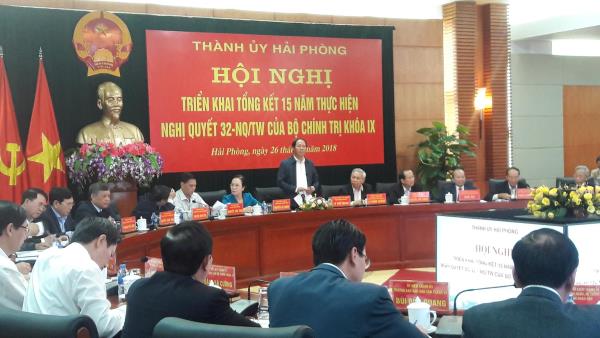 Ngày 26/3/2018, Ban Thường vụ Thành ủy tổ chức Hội nghị triển khai tổng kết 15 năm thực hiện Nghị quyết số 32-NQ/TW của Bộ Chính trị khóa IX về xây dựng và phát triển thành phố Hải Phòng trong thời kỳ công nghiệp hóa, hiện đại hóa đất nước. Đồng chí Lê Văn Thành, Ủy viên Trung ương Đảng, Bí thư Thành ủy, Chủ tịch HĐND thành phố – Chủ trì Hội nghị. Đại biểu Trung ương có đồng chí Vũ Trọng Bình, Vụ trưởng Vụ địa phương, Ban Kinh tế Trung ương; PGS.TS Trần Đình Thiên, Viện trưởng Viện Kinh tế Việt Nam. Cùng dự có các đồng chí thành viên Ban Chỉ đạo của Thành ủy tổng kết 15 năm thực hiện Nghị quyết số 32-NQ/TW; các đồng chí Phó Chủ tịch Uỷ ban nhân dân thành phố; Trưởng ban Ban Dân vận Thành ủy; các đồng chí phụ trách các nhóm biên tập của Tổ Biên tập. Hội nghị có sự tham dự của các đồng chí nguyên Bí thư Thành uỷ, nguyên Phó Bí thư Thường trực Thành uỷ, nguyên Chủ tịch Hội đồng nhân dân thành phố, nguyên Chủ tịch Uỷ ban nhân dân thành phố đang nghỉ hưu trên địa bàn thành phố.