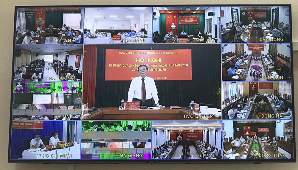 Sáng 1/7, Học viện Chính trị Quốc gia Hồ Chí Minh tổ chức Hội nghị trực tuyến toàn quốc triển khai thực hiện Quy định số 11-QĐ/TW ngày 19/5/2021 của Ban Bí thư về Trường Chính trị chuẩn. GS.TS Nguyễn Xuân Thắng, Ủy viên Bộ Chính trị, Giám đốc Học viện Chính trị quốc gia Hồ Chí Minh, Chủ tịch Hội đồng Lý luận Trung ương chủ trì Hội nghị.