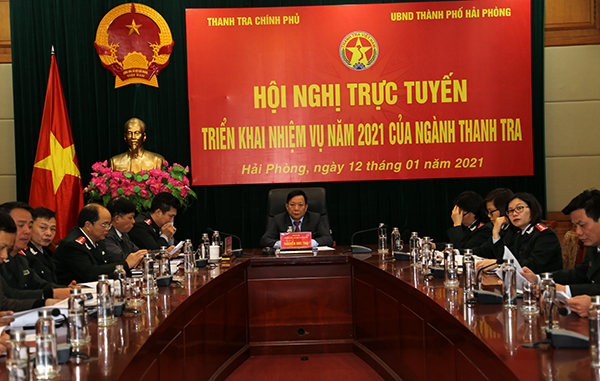 Chiều 12/1, Thanh tra Chính phủ tổ chức hội nghị trực tuyến triển khai công tác ngành Thanh tra 2021 với 63 tỉnh, thành phố trực thuộc Trung ương. Đồng chí Nguyễn Xuân Phúc, Ủy viên Bộ Chính trị, Thủ tướng Chính phủ dự và chỉ đạo hội nghị. Cùng dự có đồng chí Phan Đình Trạc, Bí thư Trung ương Đảng, Trưởng Ban Nội chính Trung ương; đồng chí Lê Minh Khái, Ủy viên Trung ương Đảng, Tổng Thanh tra Chính phủ và đại diện các bộ, ngành liên quan. Dự hội nghị tại điểm cầu Hải Phòng có đồng chí Nguyễn Đức Thọ, Phó Chủ tịch UBND thành phố cùng đại diện các phòng chức năng Thanh tra thành phố, Thanh tra một số sở, ngành, UBND quận, huyện.