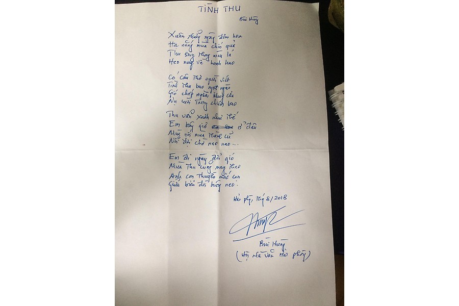 Bài thơ “Tình thu” của nhà thơ Bùi Hùng vừa hoàn thành sáng 28-8, ngay trước khi chương trình bắt đầu.