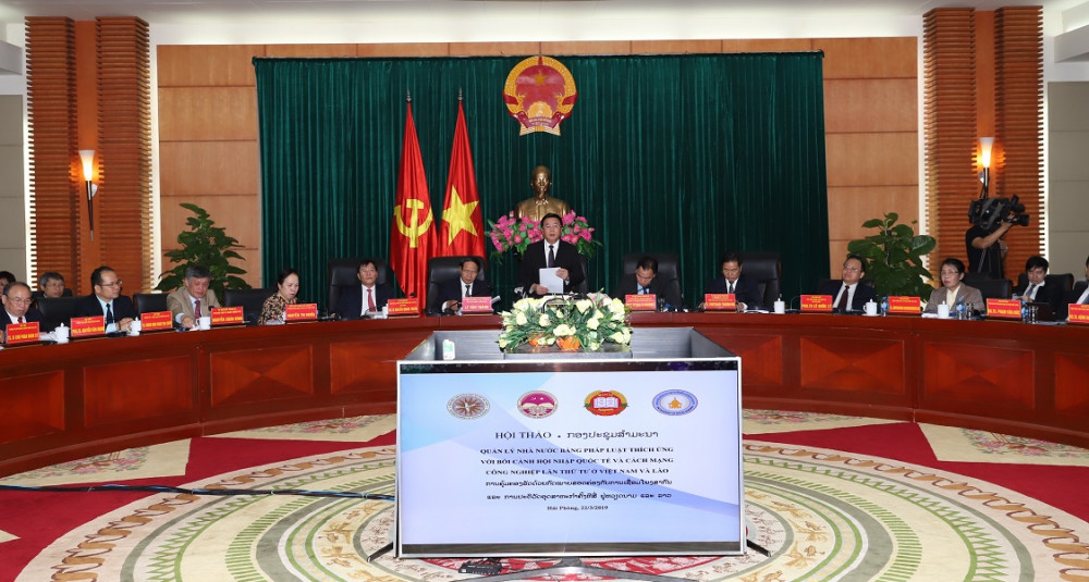 Theo lời phát biểu của GS.TS Nguyễn Xuân Thắng, cuộc cách mạng công nghiệp lần thứ tư xuất hiện và phát triển với tốc độ nhanh trên nhiều lĩnh vực, đang tạo ra những thay đổi sâu sắc trên mọi mặt của đời sống xã hội. Việt Nam và Lào là hai quốc gia đang trong quá trình công nghiệp hóa – hiện đại hóa, chủ động và tích cực hội nhập quốc tế. Cuộc cách mạng công nghiệp 4.0 đã mở ra cho hai nước nhiều cơ hội trong việc nâng cao trình độ công nghệ, năng lực sản xuất và cạnh tranh, tuy nhiên bên cạnh đó cũng có không ít thách thức đan xen. Để thích ứng với bối cảnh hiện nay, Việt Nam và Lào cần đổi mới phương thức quản lý Nhà nước bằng pháp luật, hướng tới nền quản trị mở dựa trên nền tảng công nghệ thong tin.