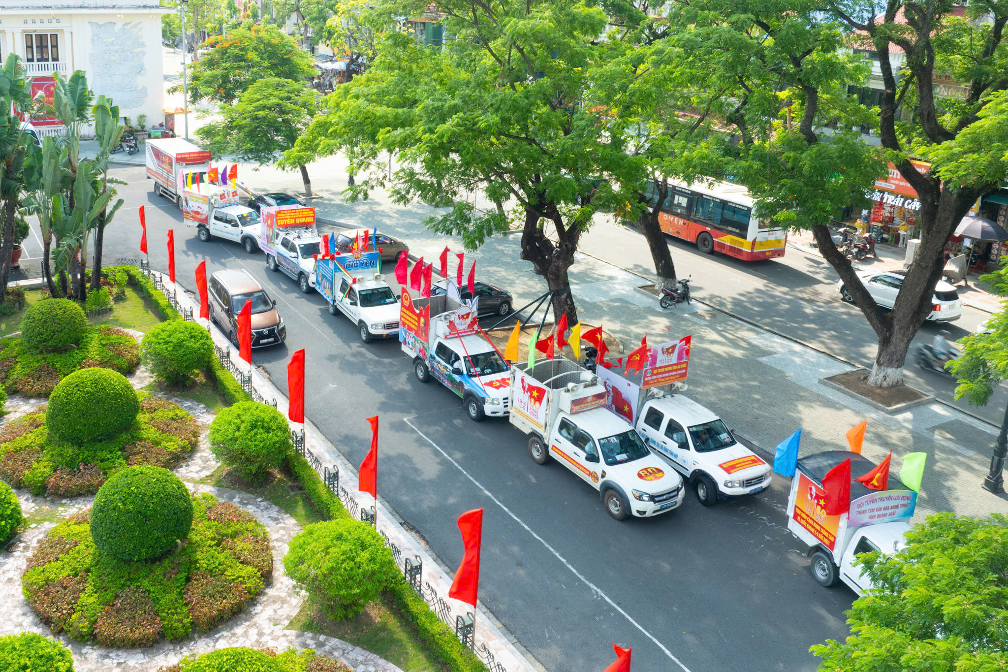 Các xe tuyên truyền lưu động được trang trí đẹp, chắc chắn, có loa phóng thanh, sử dụng hình ảnh cổ động trực quan, cờ hoa kèm theo khẩu hiệu ngắn gọn, đảm bảo tính thẩm mỹ, an toàn, tiện lợi, cơ động và hiệu quả tuyên truyền cao khi tham gia diễu hành dọc tuyến đường.