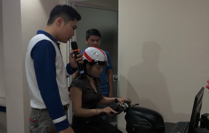 Hướng dẫn đoàn viên thực hành lái xe trên máy tập