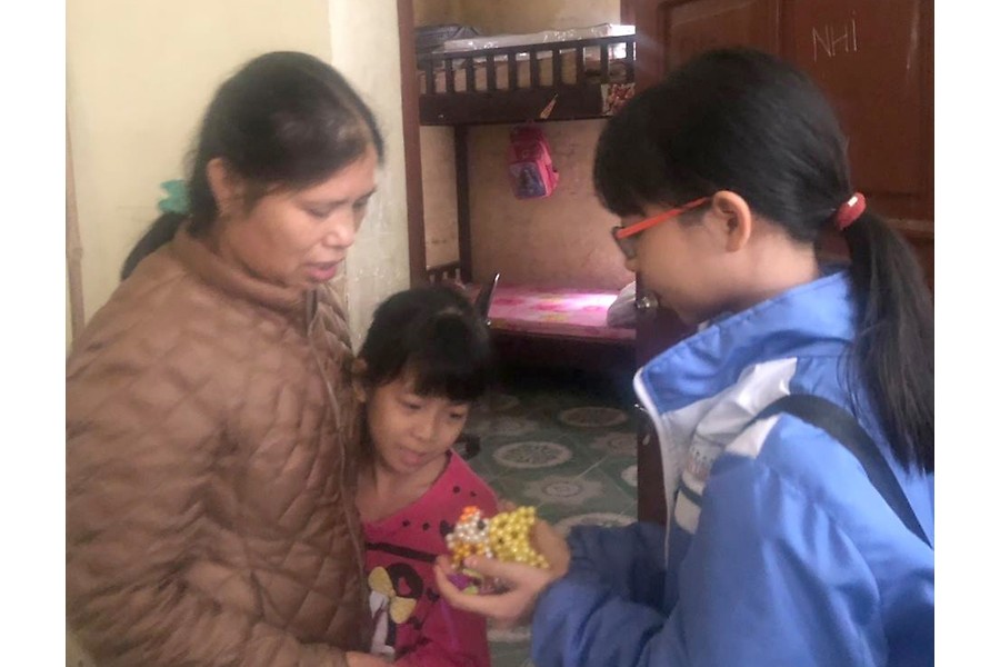 Học sinh Trường THCS Hồng Bàng tặng quà các bạn tại Làng nuôi dạy trẻ mồ côi Hoa Phượng.