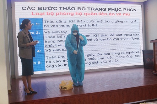 Tại buổi tập huấn, các cán bộ y tế đã được hướng dẫn cách sử dụng phương tiện phòng hộ cá nhân và các bước trong quy trình lấy mẫu, bảo quản, vận chuyển mẫu xét nghiệm SARS-CoV-2. Đây là công việc tiếp xúc trực tiếp với bệnh phẩm của người bệnh, có nguy cơ lây nhiễm rất cao nên các cán bộ y tế được hướng dẫn chi tiết từ khâu mặc, tháo trang phục phòng hộ cá nhân đến các bước trong việc hoàn thiện một quy trình lấy mẫu xét nghiệm bệnh phẩm cho người bệnh.