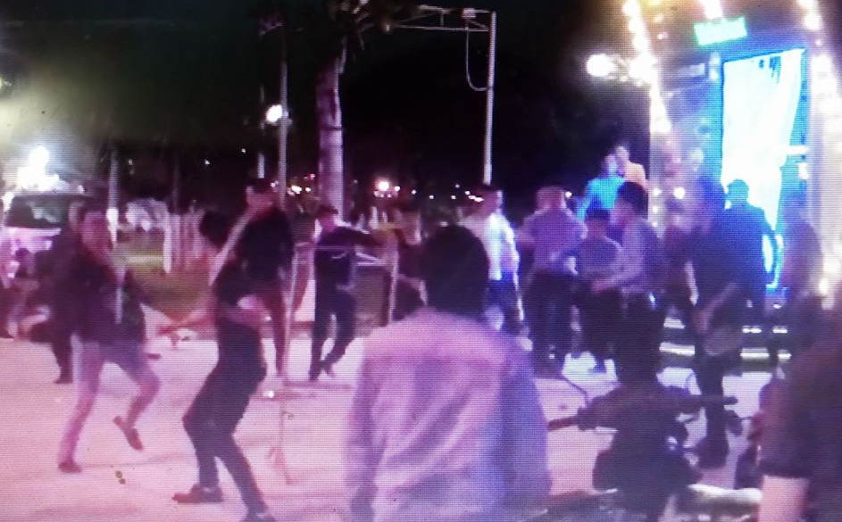 Tại đây, nhóm Hưng, Quyết, Thành, Cương đi đến bàn Vip 2 để nói chuyện với nhóm của Cường. Hưng dùng tay vẫy Cường thì Thao từ phía sau bất ngờ cầm dao xông đến. Thấy vậy, Quyết dùng tay cản lại nên bị thương. Sau đó, Thao tiếp tục cầm dao đâm sượt vào ngực và kề vào cổ Hưng. Cùng lúc, Cường túm cổ áo, đâm 2-3 nhát sượt qua phần ngực của Hưng. Thao cùng Cường tiếp tục khống chế lôi Hưng ra phía cửa phụ sau quán. Thấy Hưng bị đánh, Lê Duy Thành ném 1 cốc nước thủy tinh về phía nhóm “đối thủ” nhưng không trúng ai. Trong lúc 2 nhóm dùng cốc ném nhau, Thành bị ném vào vùng mặt gây thương tích, còn Vinh bị đập vào đầu. Bị yếu thế, nhóm Thành cùng Cương, Quyết bỏ chạy ra ngoài cửa chính.