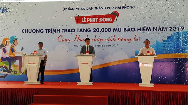 Đại diện lãnh đạo Ủy ban ATGT Quốc gia, lãnh đạo Công ty Honda Việt Nam và lãnh đạo UBND thành phố Hải Phòng đã bấm nút phát động chương trình trao tặng 20.000 mũ bảo hiểm.