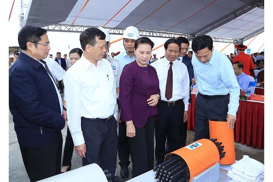 Đồng chí Nguyễn Thị Kim Ngân, Ủy viên Bộ Chính trị, Chủ tịch Quốc hội; Phạm Minh Chính, Ủy viên Bộ Chính trị, Trưởng Ban tổ chức Trung ương; Lê Văn Thành, Ủy viên Trung ương Đảng, Bí thư Thành ủy, Chủ tịch HĐND thành phố Hải Phòng; Nguyễn Văn Đọc, Bí thư Tỉnh ủy Quảng Ninh cùng các đồng chí lãnh đạo Hải Phòng và Quảng Ninh thực hiện hợp long cầu Bạch Đằng. Ảnh: Duy Thính